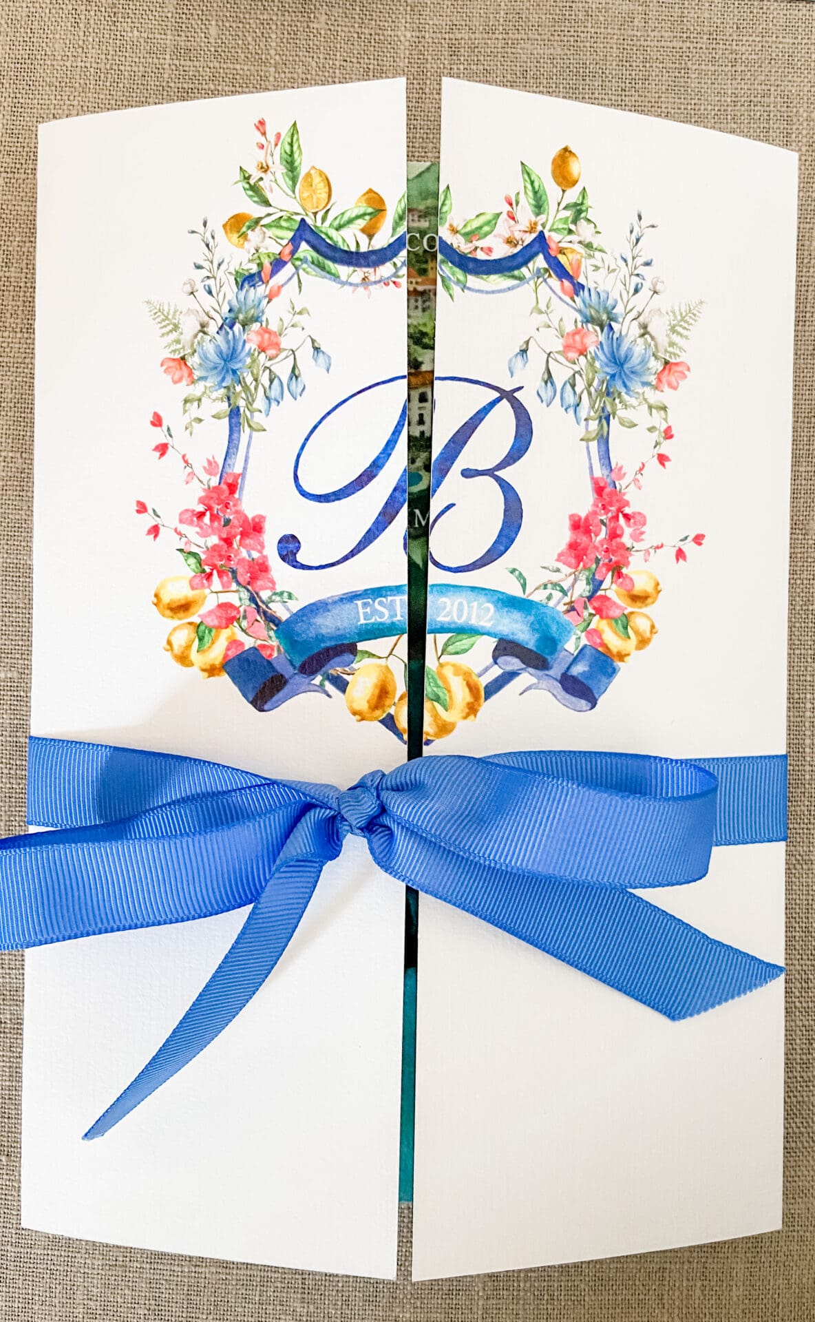 To complete the experience, the gatefold closed with a Mediterranean blue ribbon, reminiscent of the coast’s crystal-clear waters. It tied together the entire Amalfi Coast-inspired theme, offering a hint of what awaited the lucky guests at the wedding.