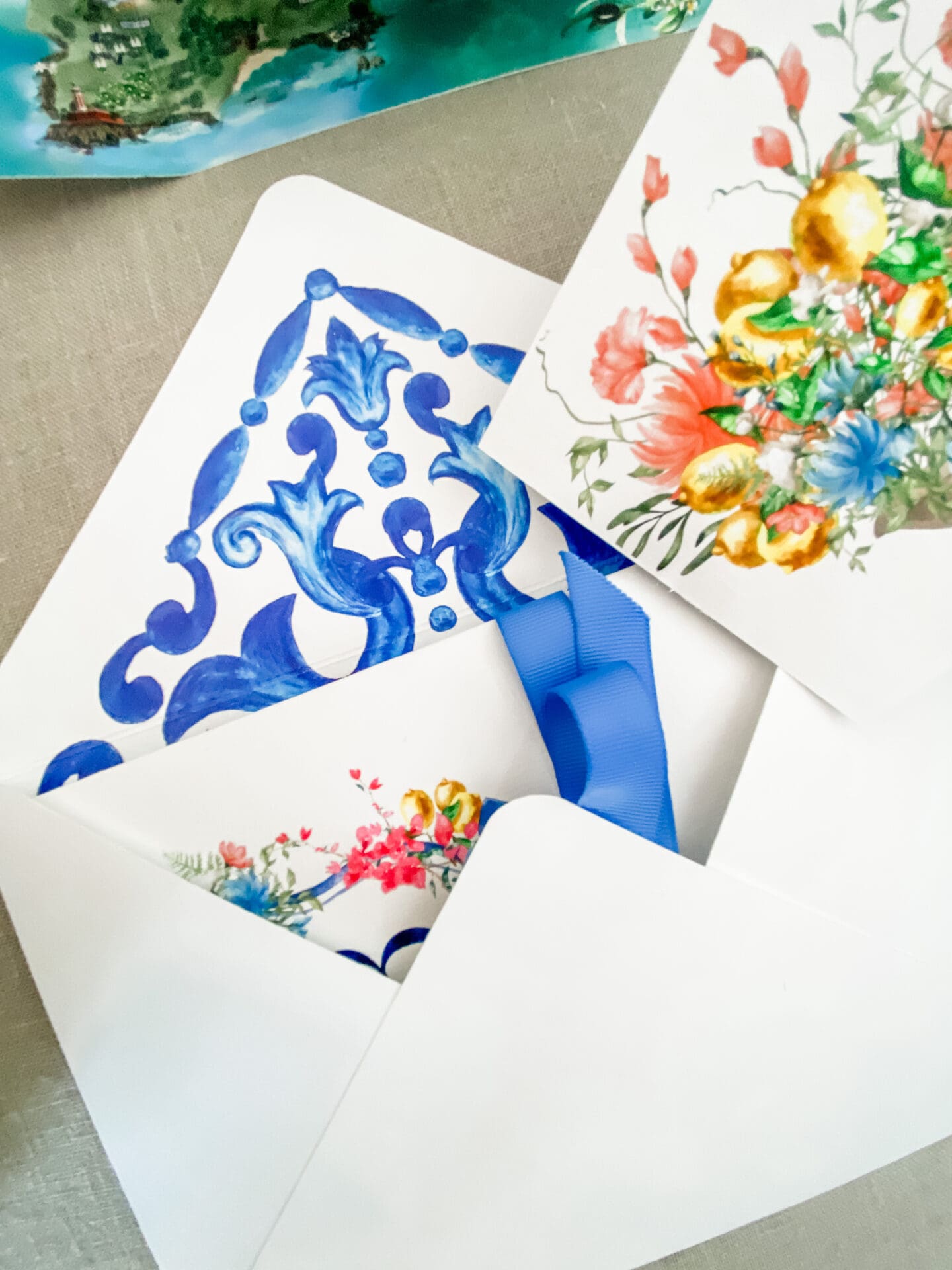 Inside the gatefold, a hand-painted masterpiece awaited their guests. The intricate details of the Amalfi Coast and the enchanting town of Ravello were lovingly painted, providing a glimpse of the stunning backdrop for Amanda and John’s wedding. It was more than an invitation; it was a work of art.