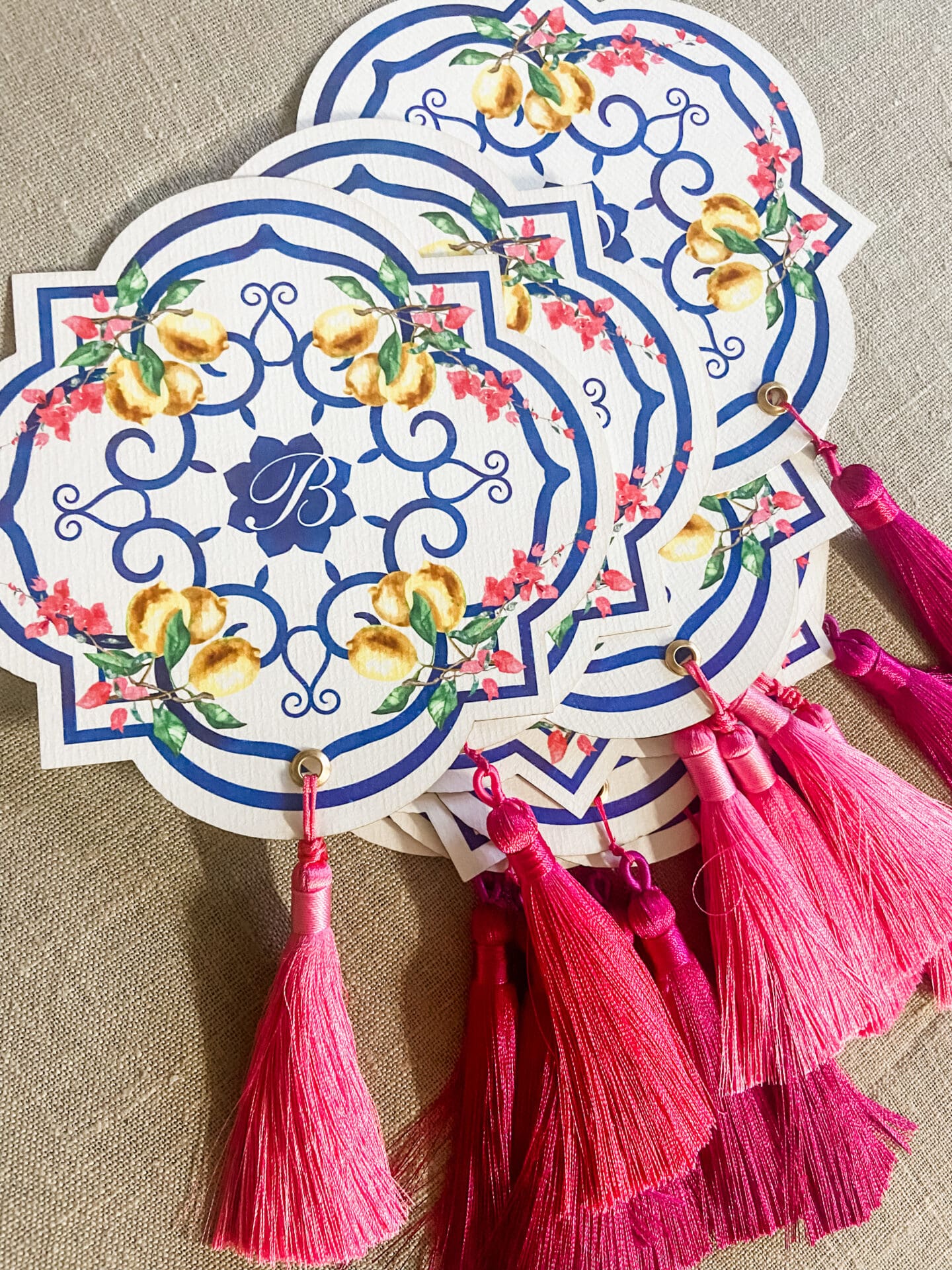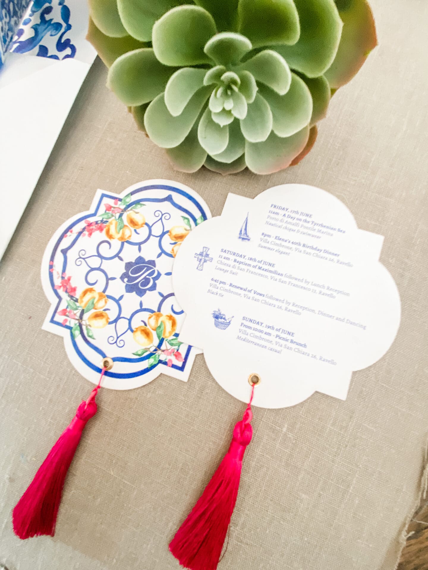 The centrepiece of their invitation suite was a beautifully shaped “Order of the Day” card. This card featured an exquisite silk tassel in a delicate shade of pink, adding a touch of elegance and sophistication. Opening the card was like stepping into the charm of the Amalfi Coast itself.
