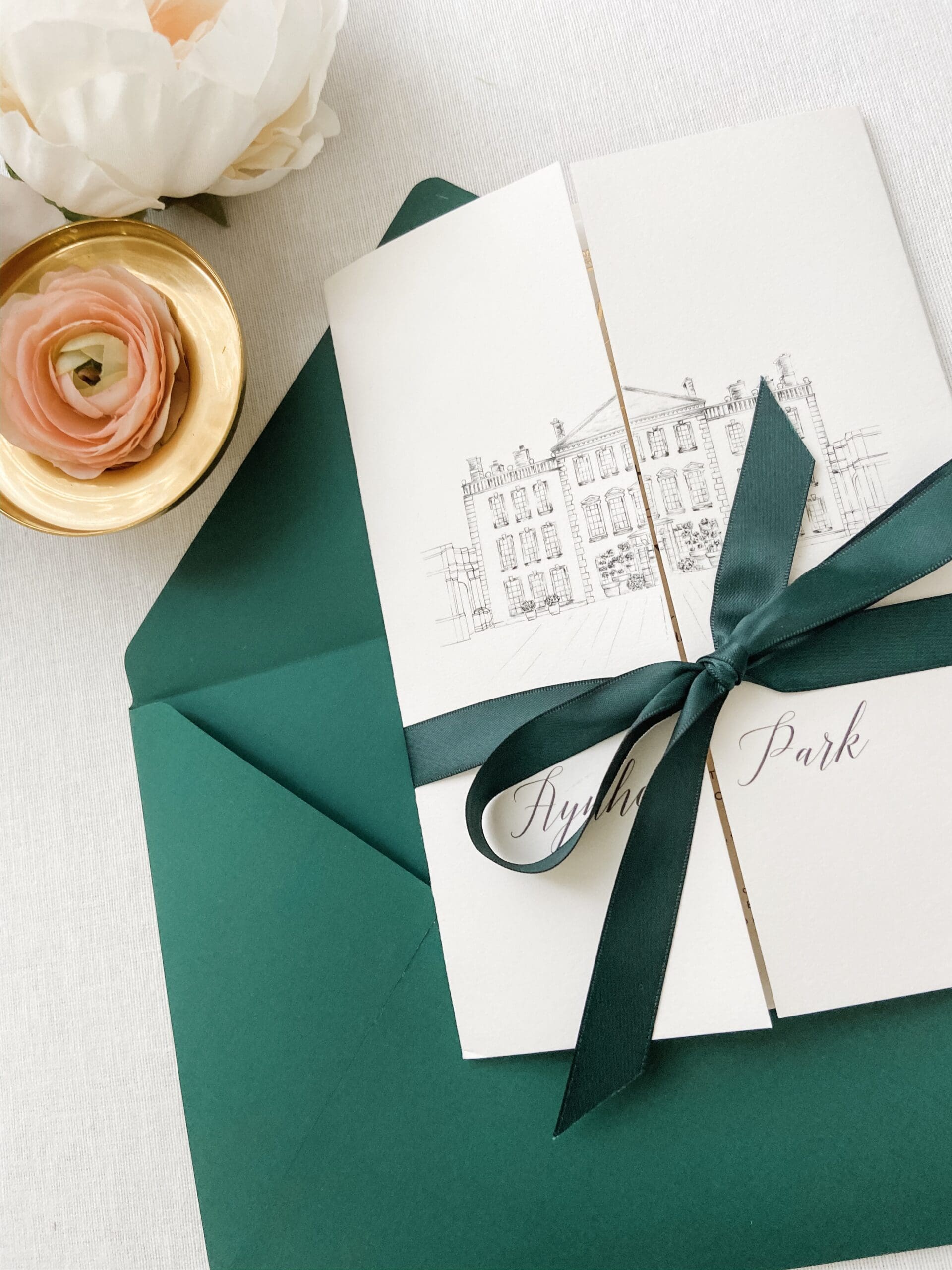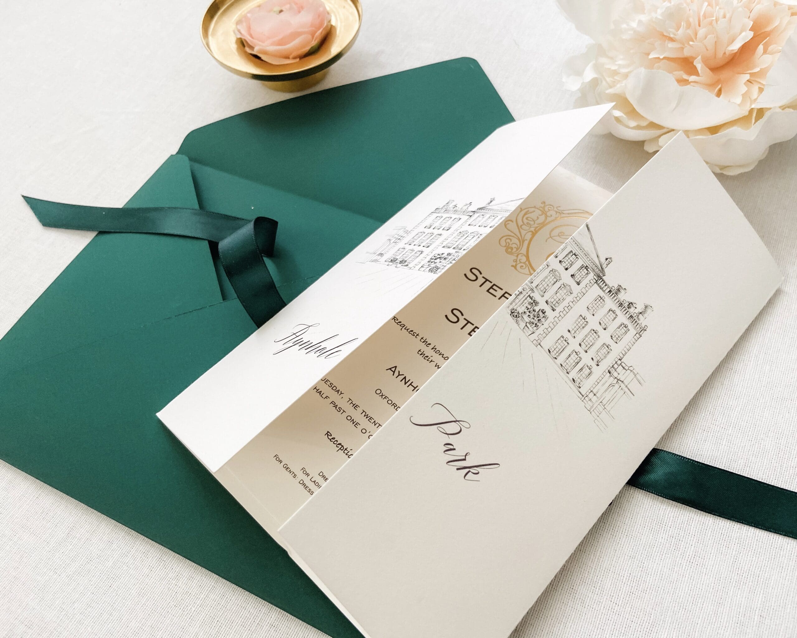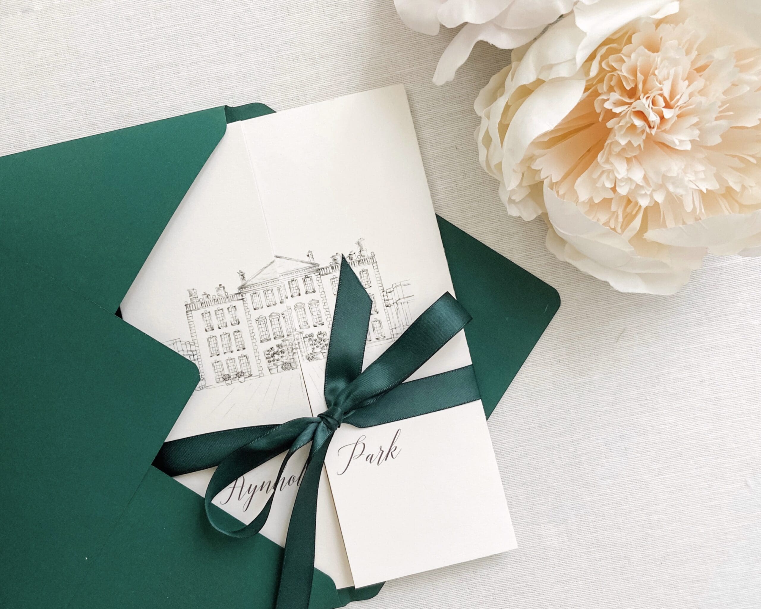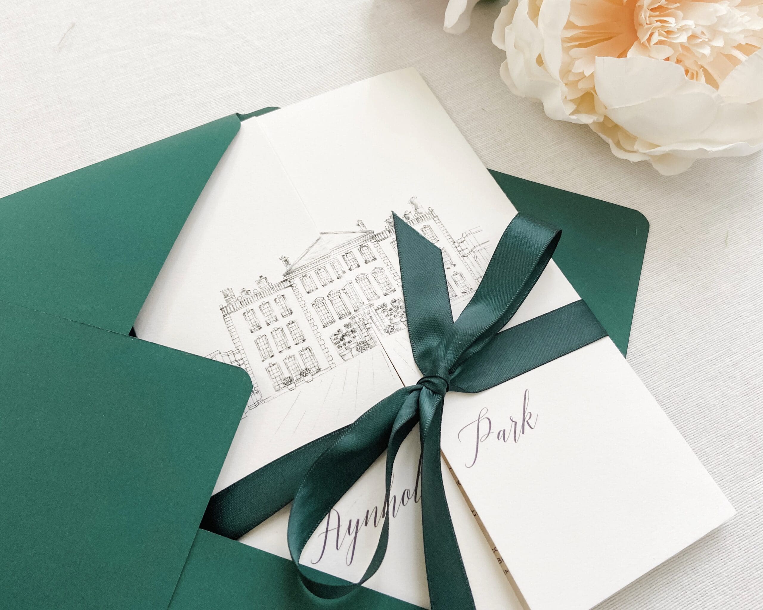 This is a hand-sketched Aynhoe Park wedding invitations, commissioned by Stephanie and Steven to present the wedding venue to their Chinese guests.