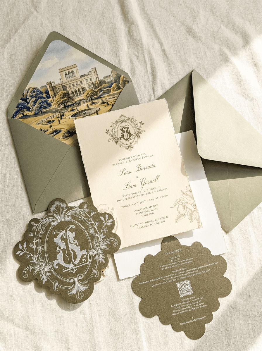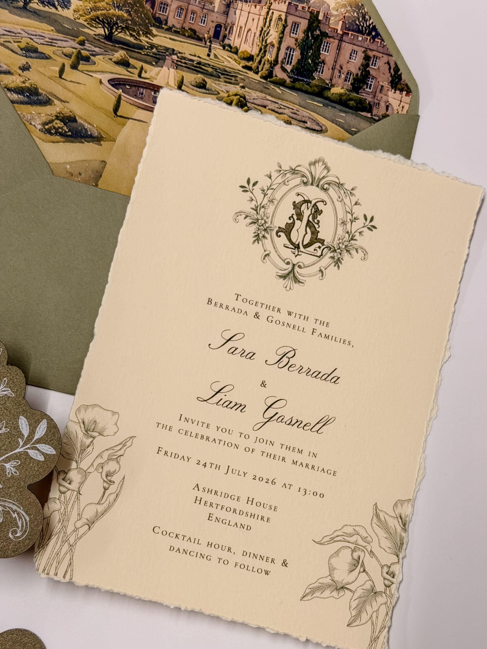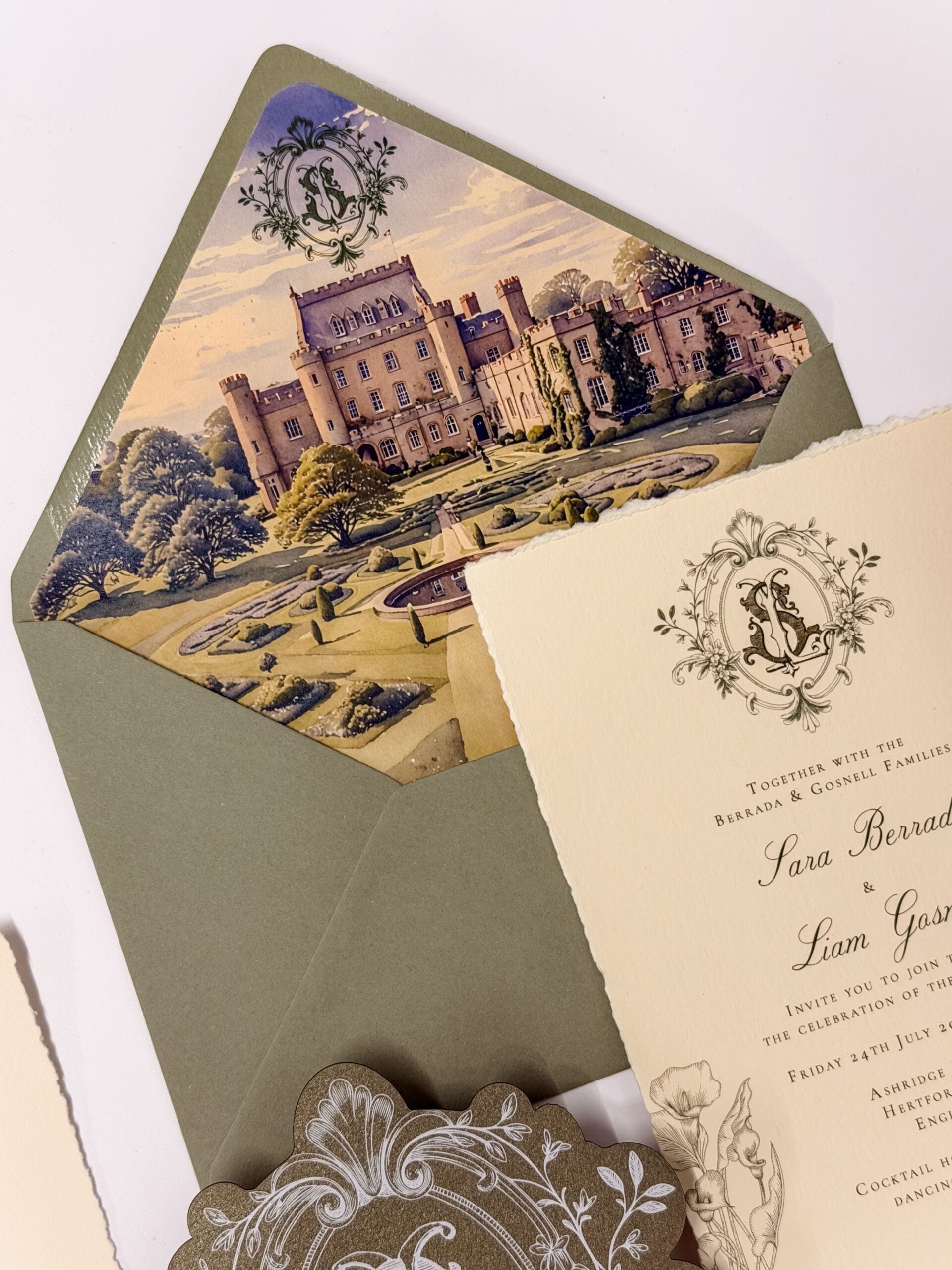 This bespoke wedding invitation suite was designed for a wedding at Ashridge House, one of the UK’s most iconic stately home wedding venues. Featuring a hand-painted watercolour illustration of the estate, the design reflects the timeless elegance of an English country house wedding and showcases our approach to luxury, bespoke wedding stationery in the UK.