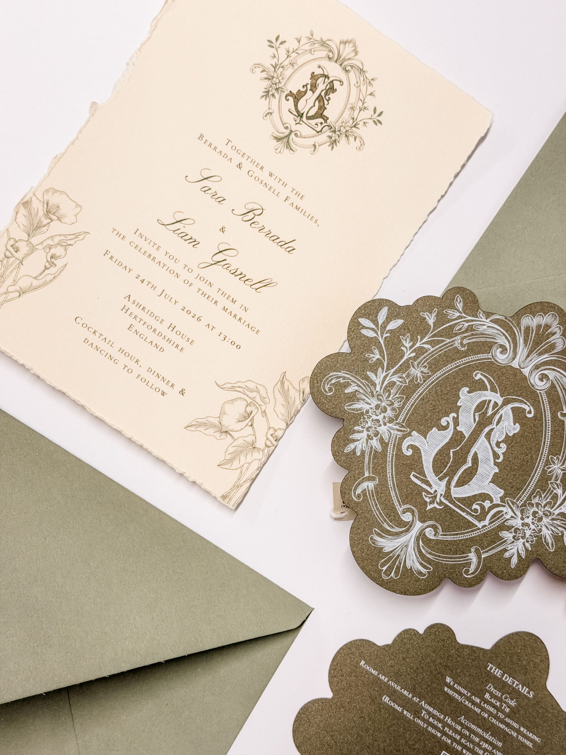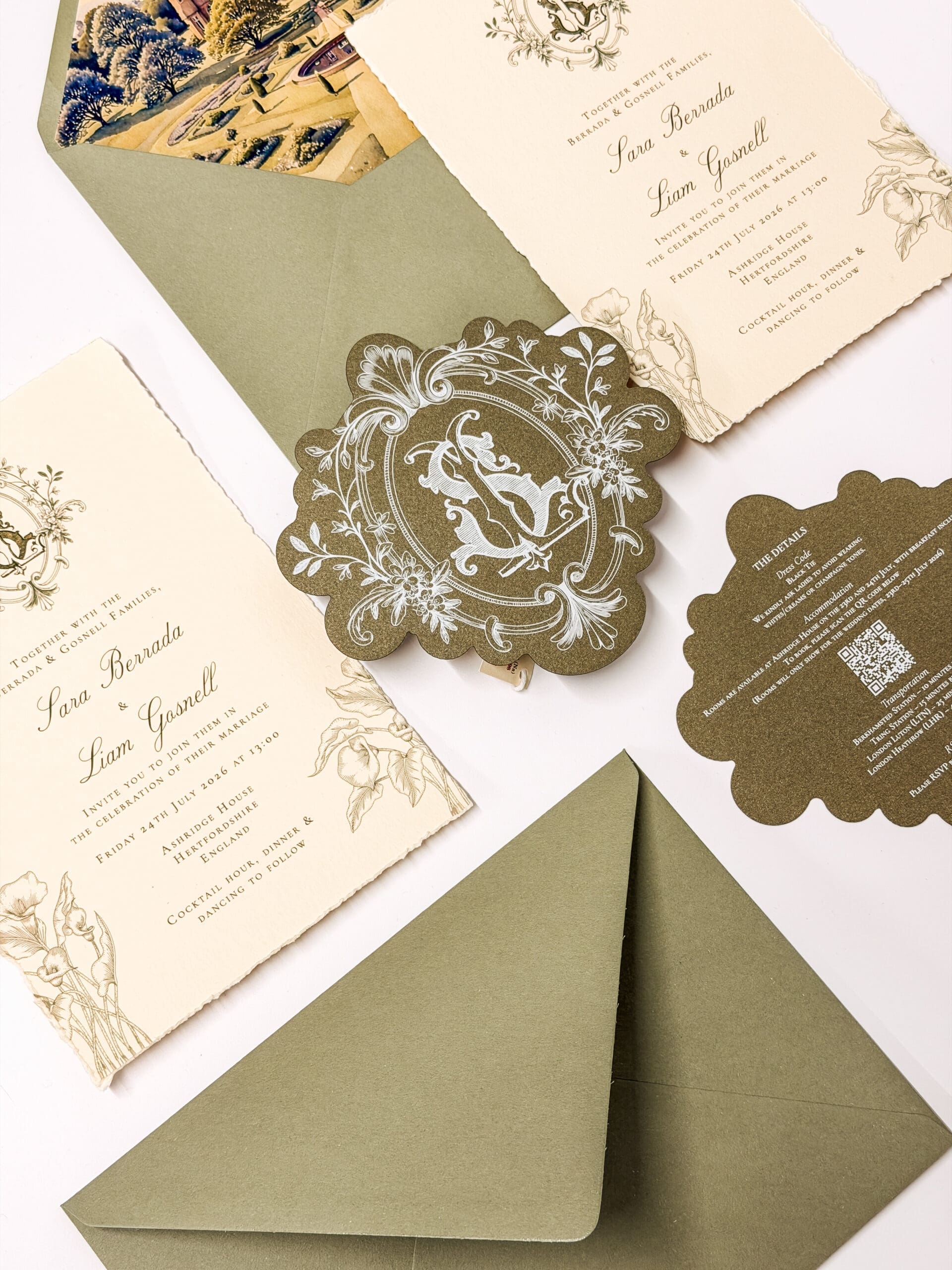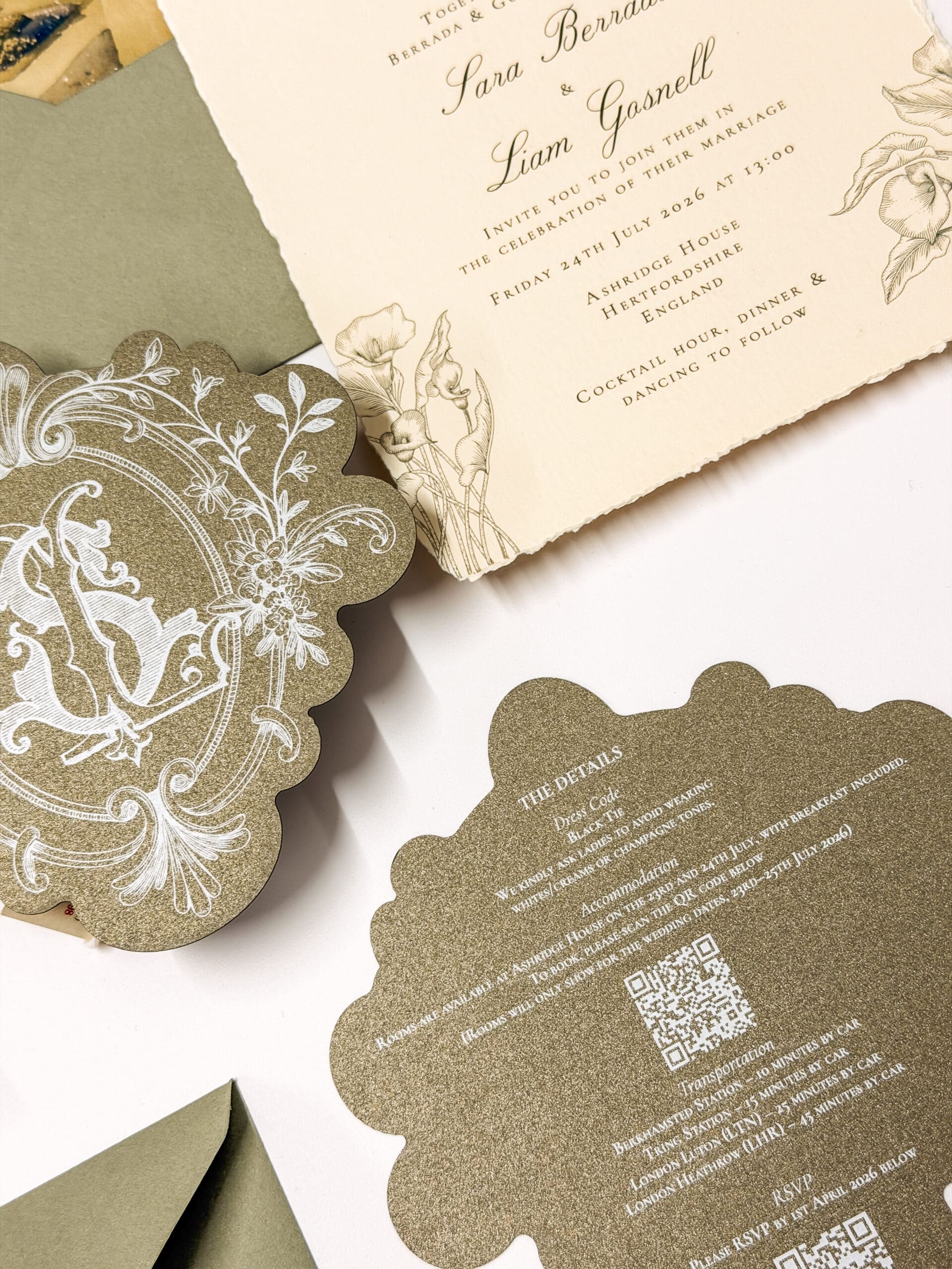 This bespoke wedding invitation suite was designed for a wedding at Ashridge House, one of the UK’s most iconic stately home wedding venues. Featuring a hand-painted watercolour illustration of the estate, the design reflects the timeless elegance of an English country house wedding and showcases our approach to luxury, bespoke wedding stationery in the UK.