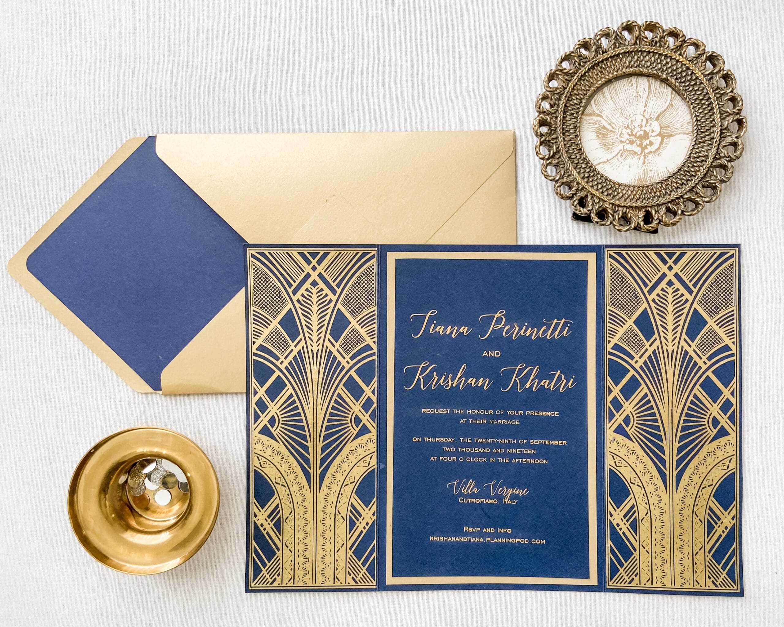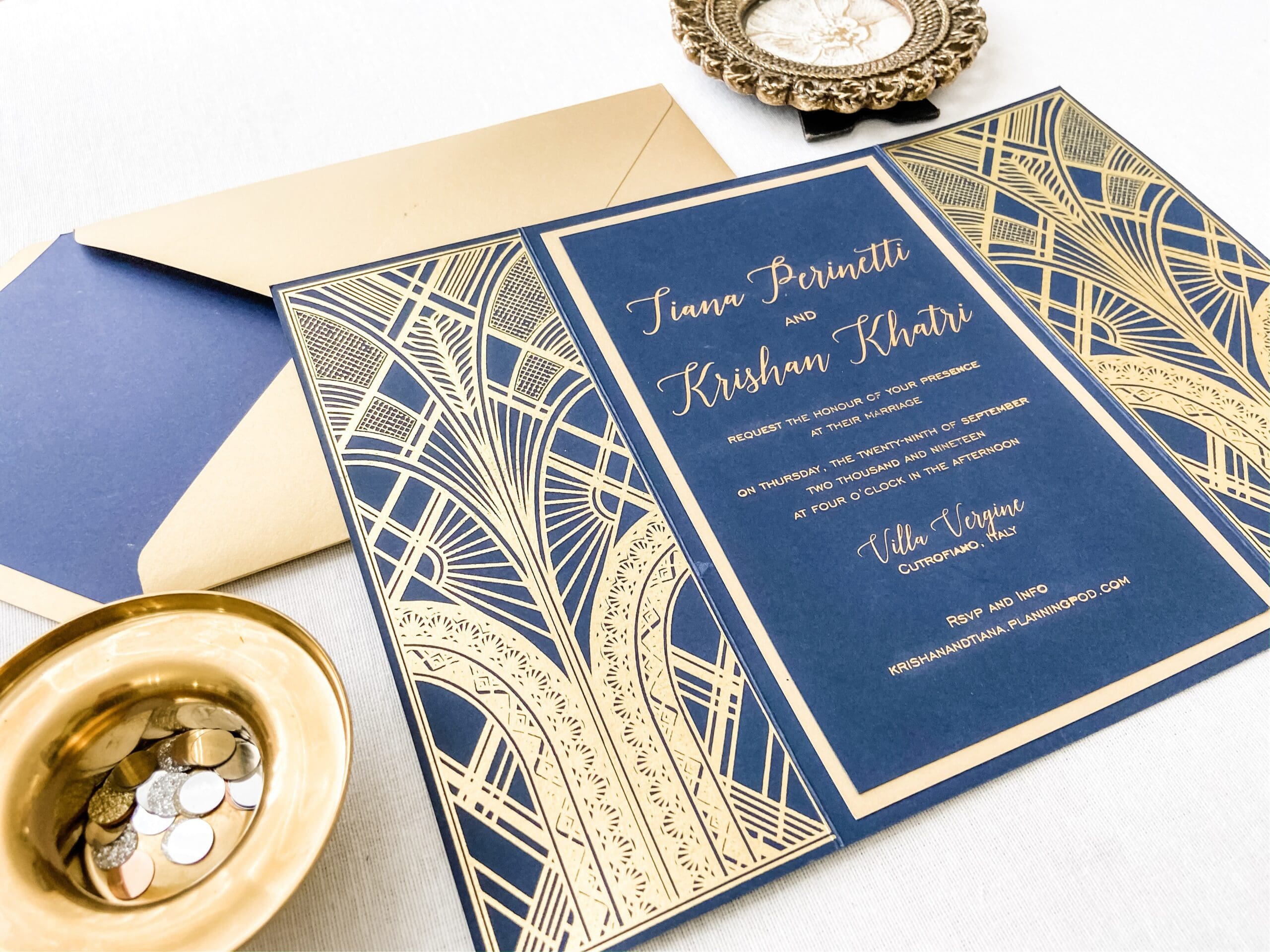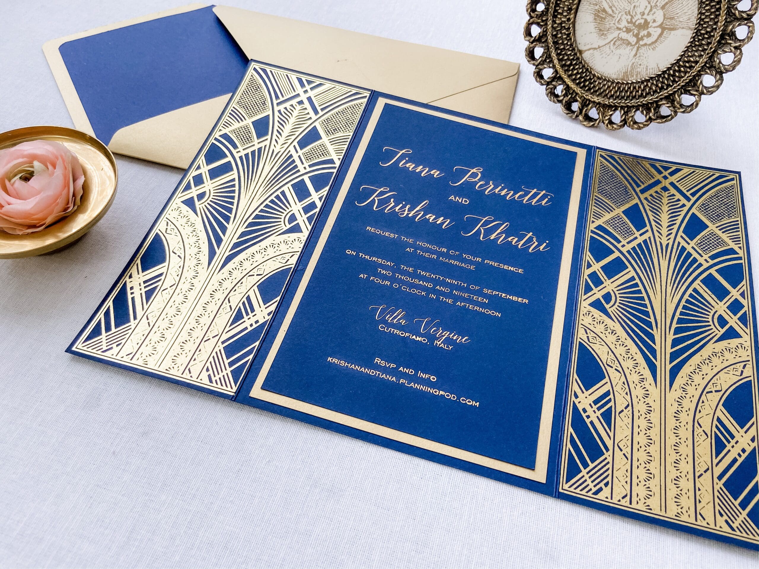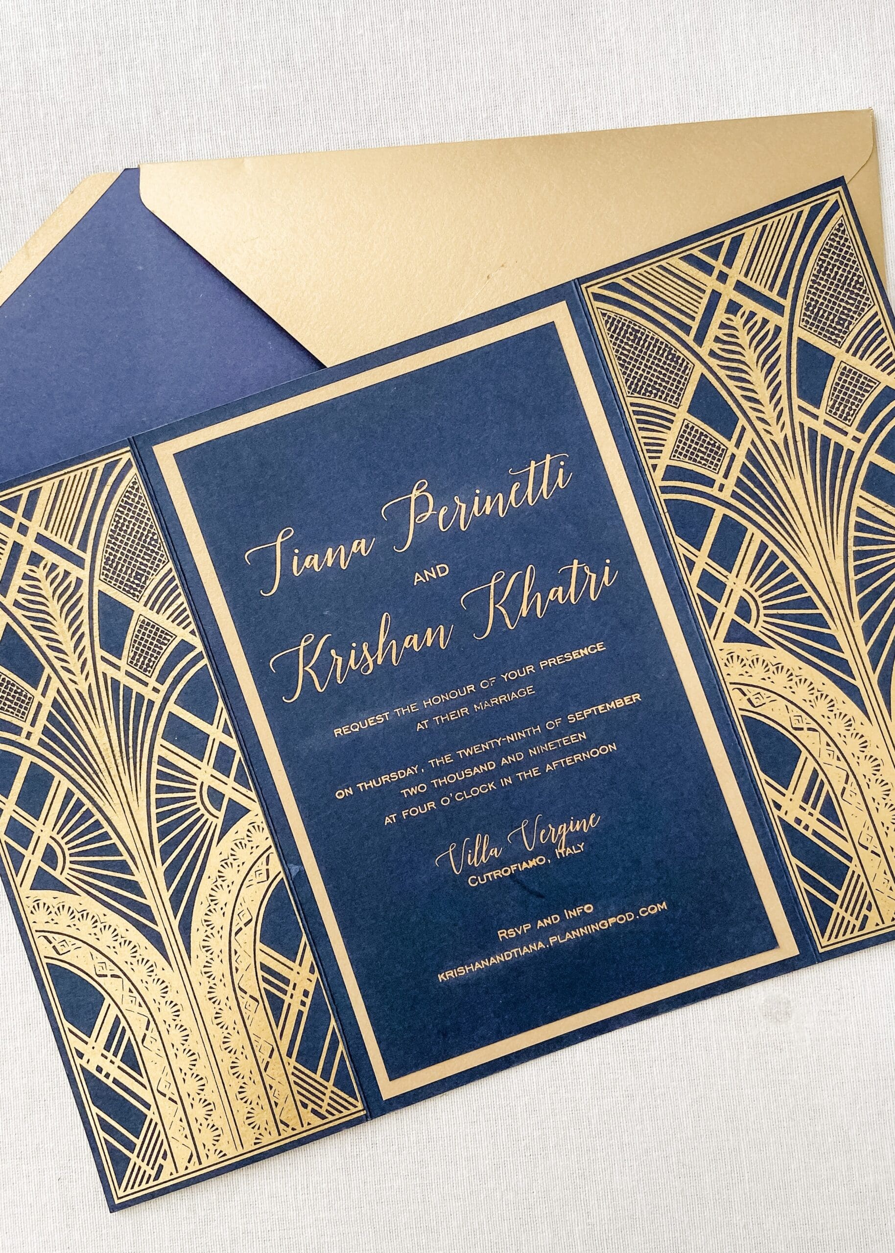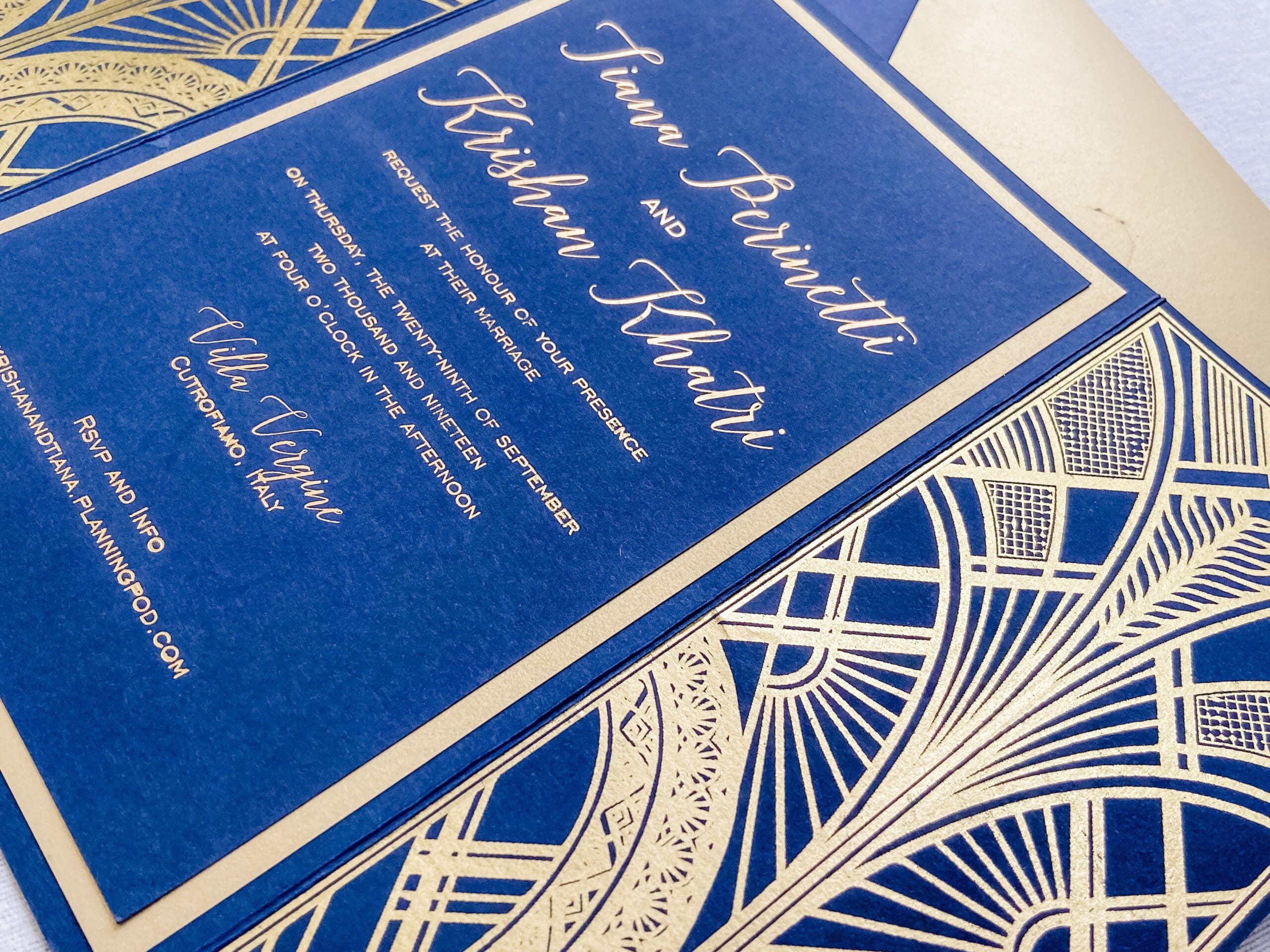 Gold Gatsby wedding invitations represent the so-called “golden revolution”: we have seen a huge increase in the popularity of gold patterns over recent months. Gold foil is often combined with dark colour paper to create a luxurious, layered look. Or, you can find contrasting art deco geometric patterns to create interest and depth.