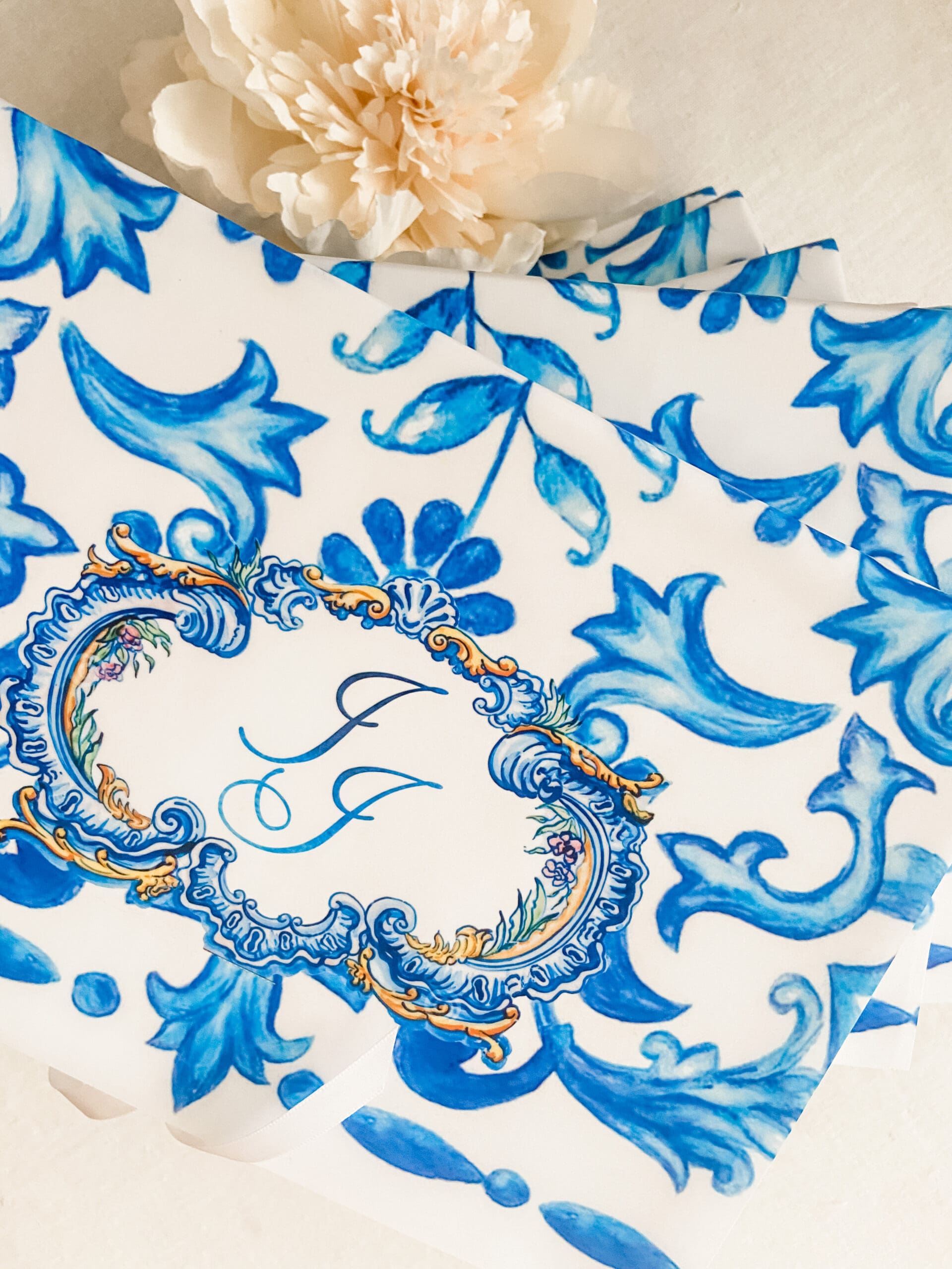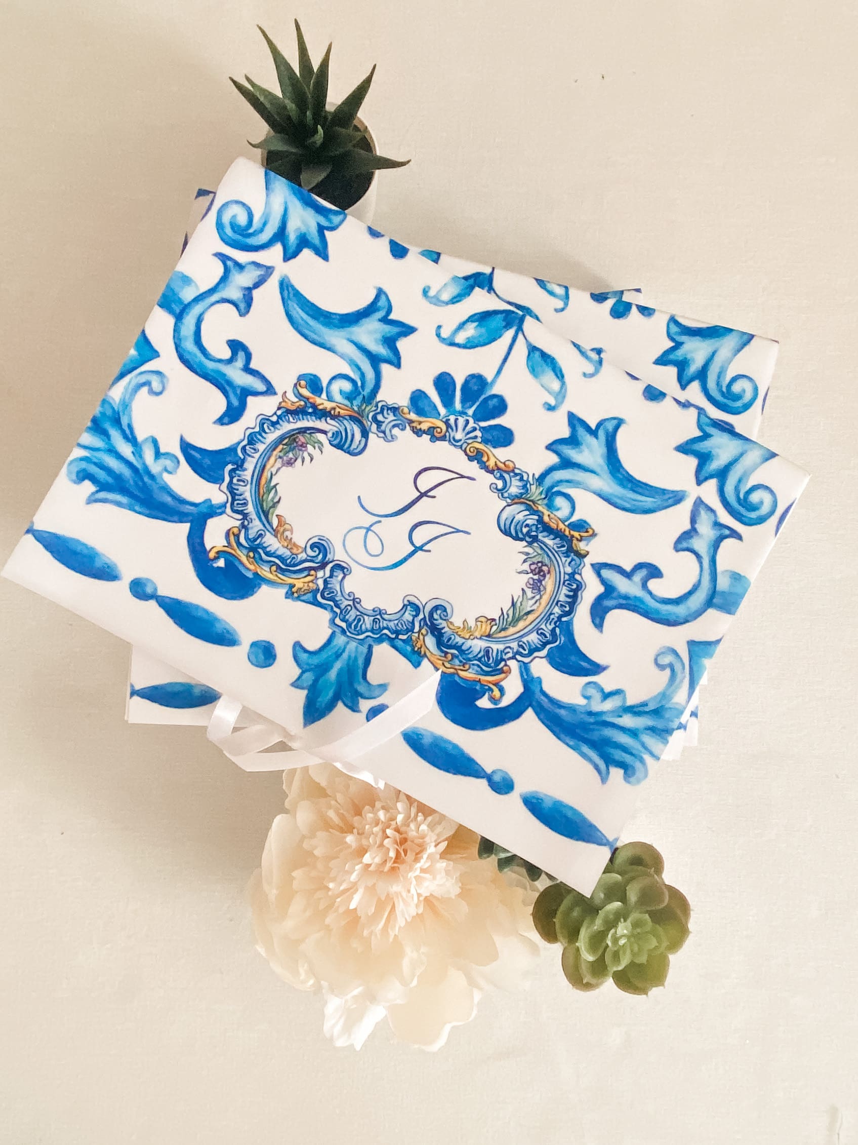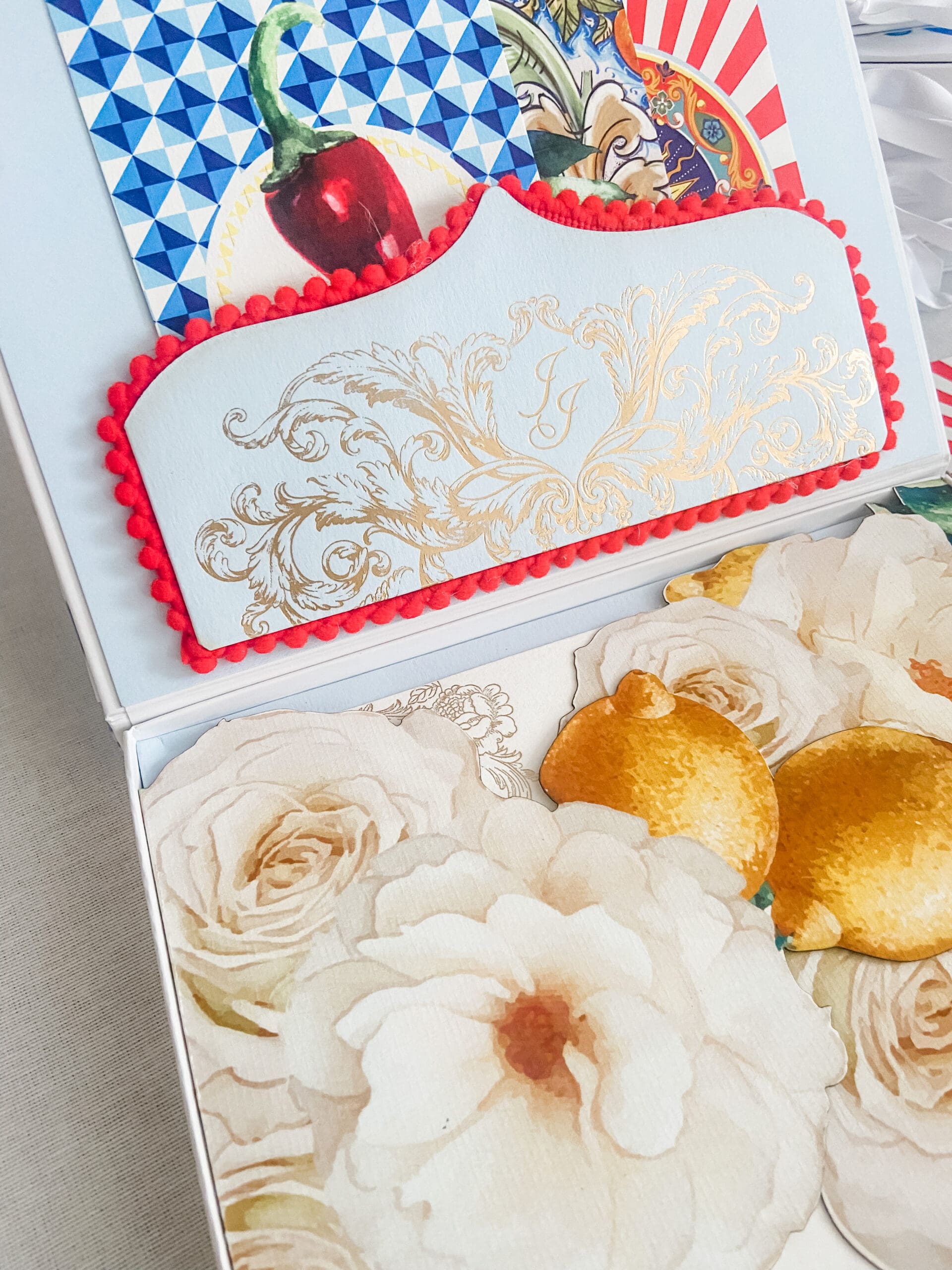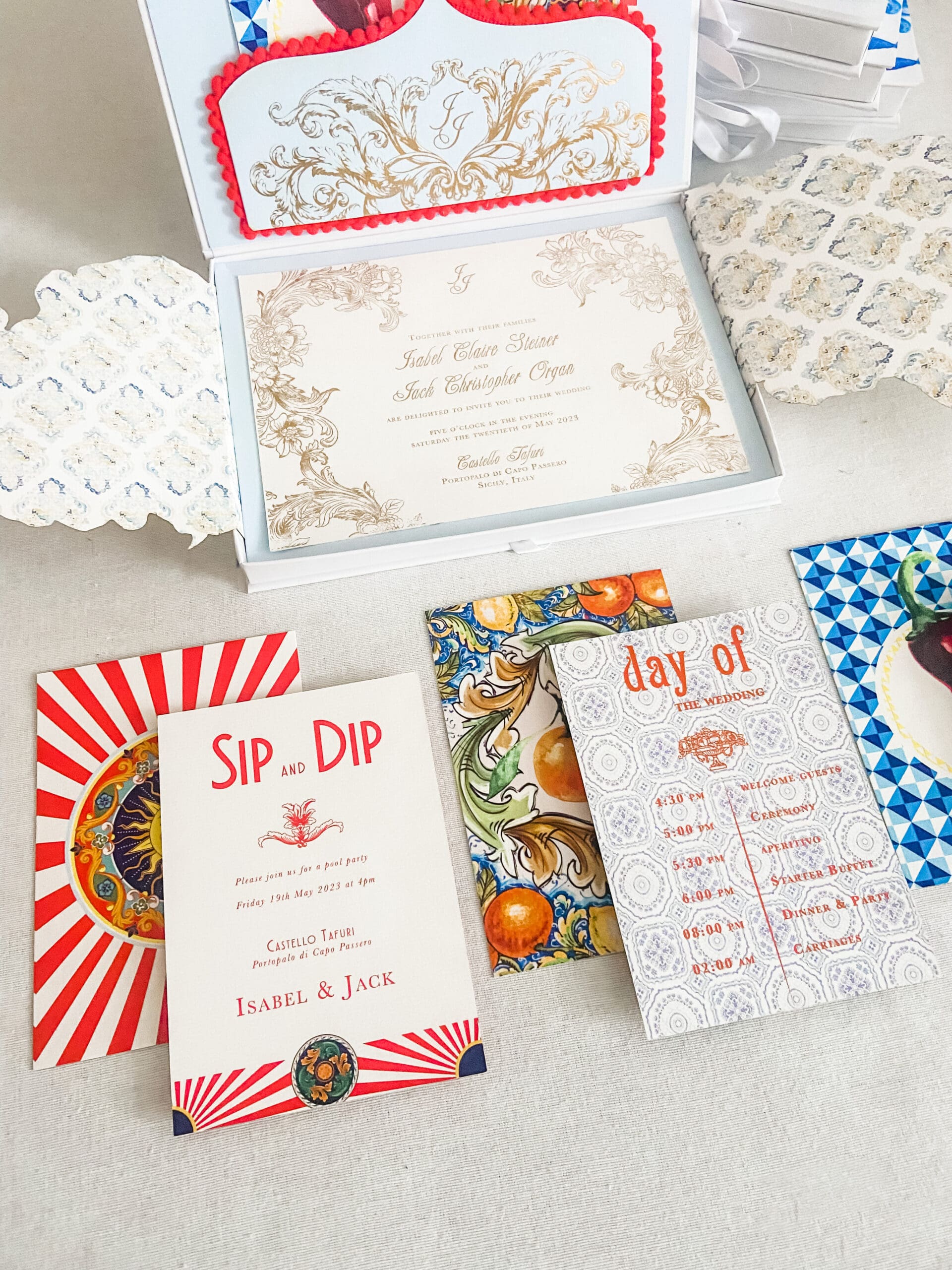 A Fashion-Forward Prelude Isabel and Jack’s wedding invitations were more than just paper; they were a work of art. Drawing inspiration from watercolour Sicilian tiles and traditional designs, the box invitations featured intricate traditional Sicilian designs, rich gold accents, scarlet red trimmings and a deep blue palette reminiscent of Dolce & Gabbana’s iconic creations. They served as a stylish prelude to the grandeur that awaited.