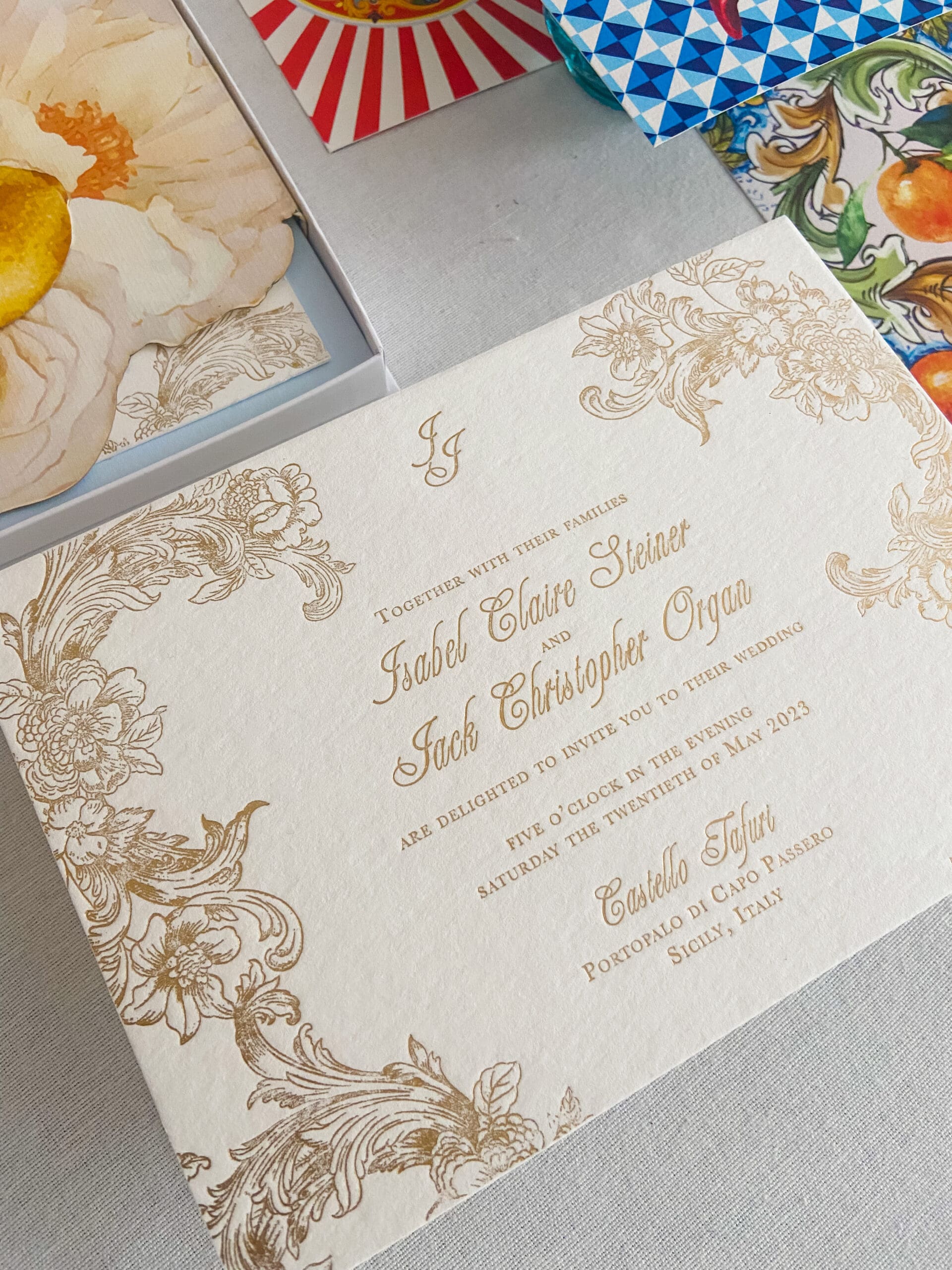 In the heart of Marzamemi, where love and luxury met, Isabel and Jack embarked on a wedding journey inspired by Dolce & Gabbana’s opulence. Every detail, from bespoke wedding invitations to day-of stationery, was a testament to their commitment to creating an extraordinary celebration.