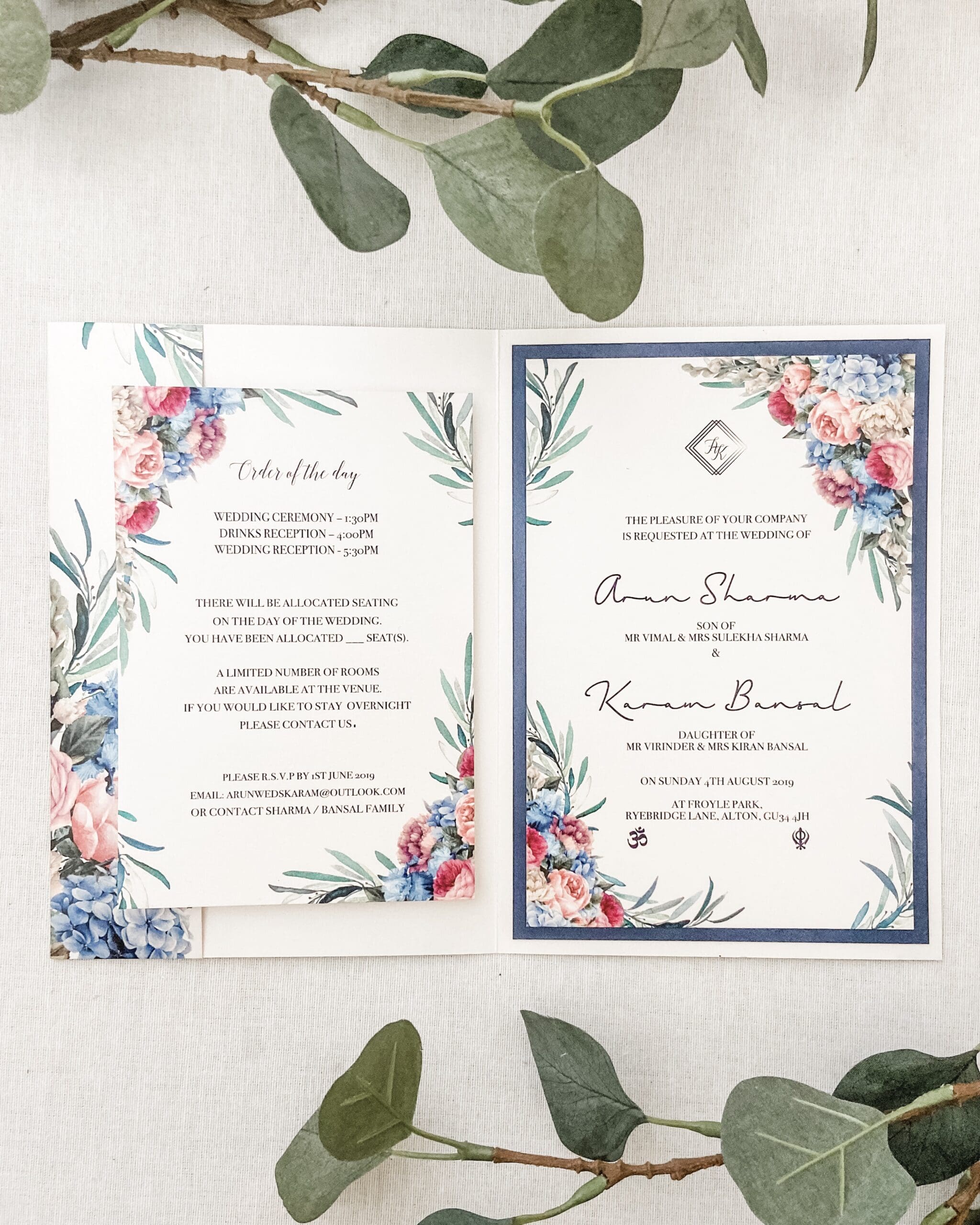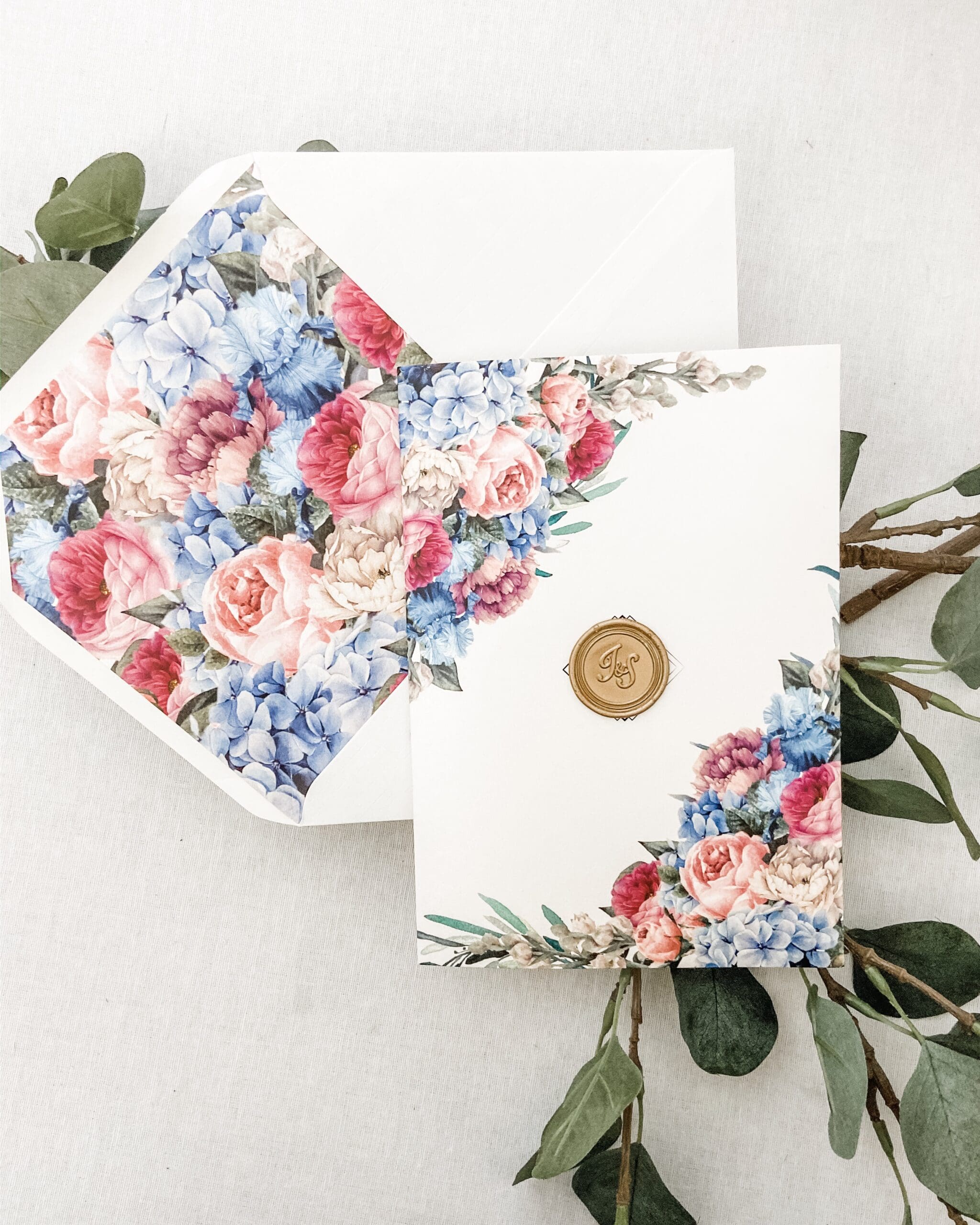 Flower Pocket Wedding Invitation it’s a modern, yet classic pocket invite which will make your wedding truly special. The cover features beautiful flowers that will be displayed on the wedding day. The front of the pocket has a bespoke wax seal with the initials of bride and groom.