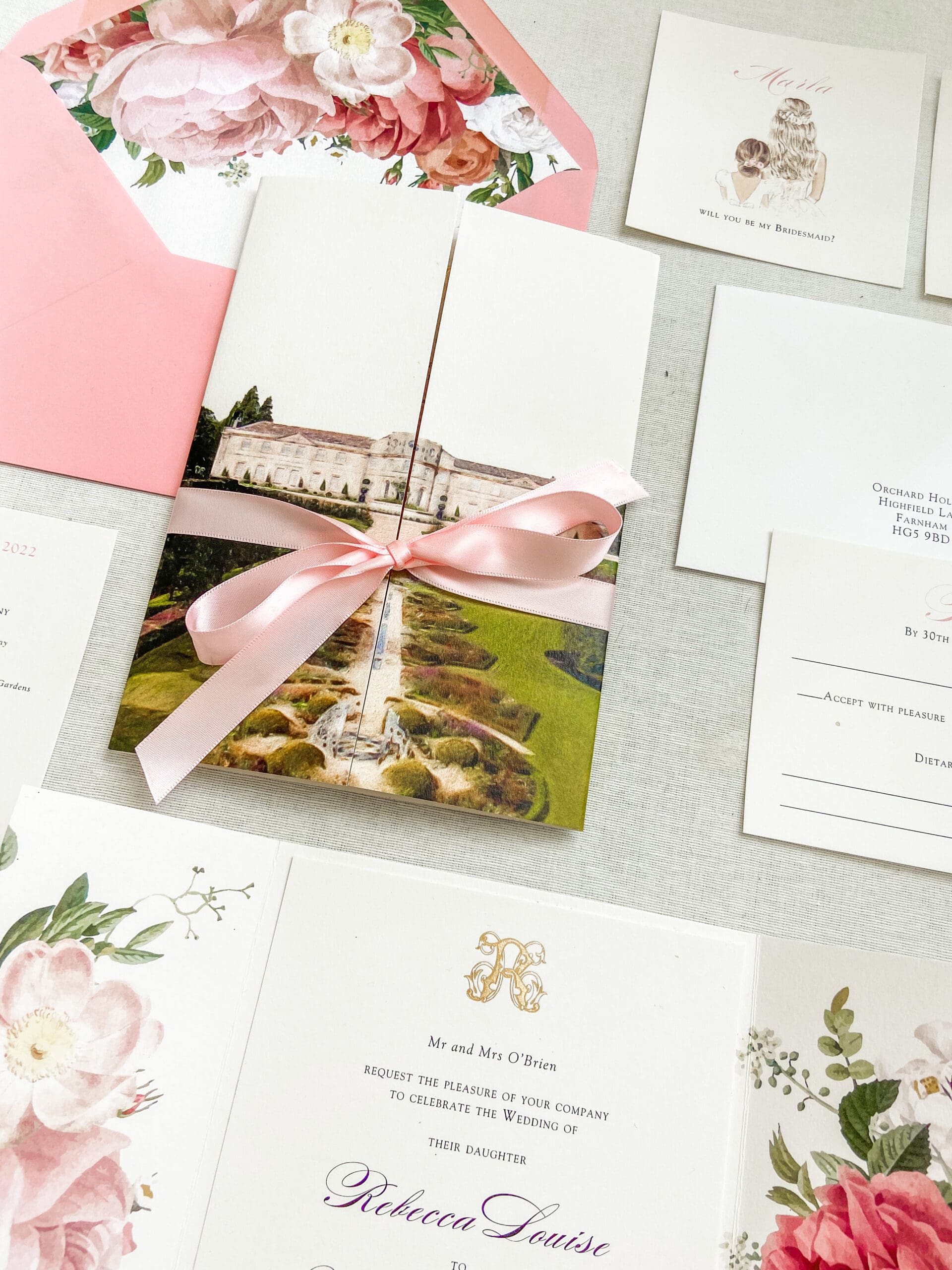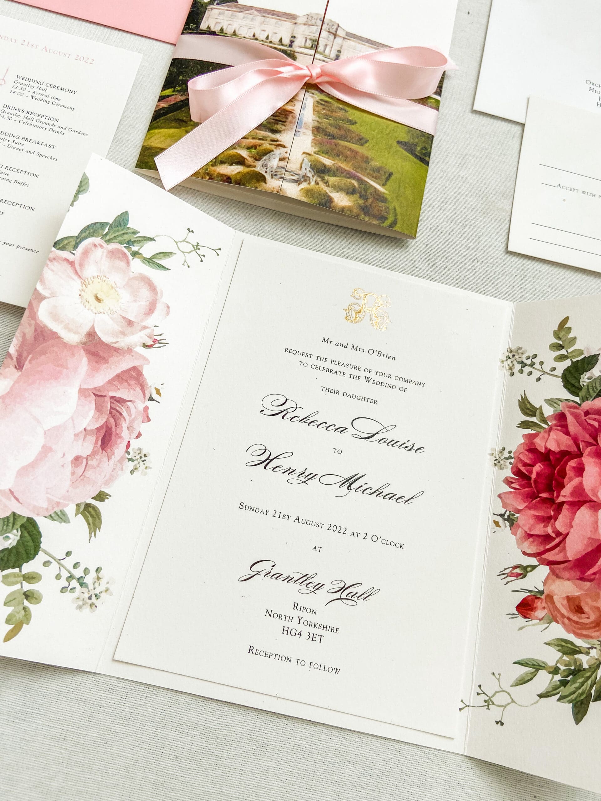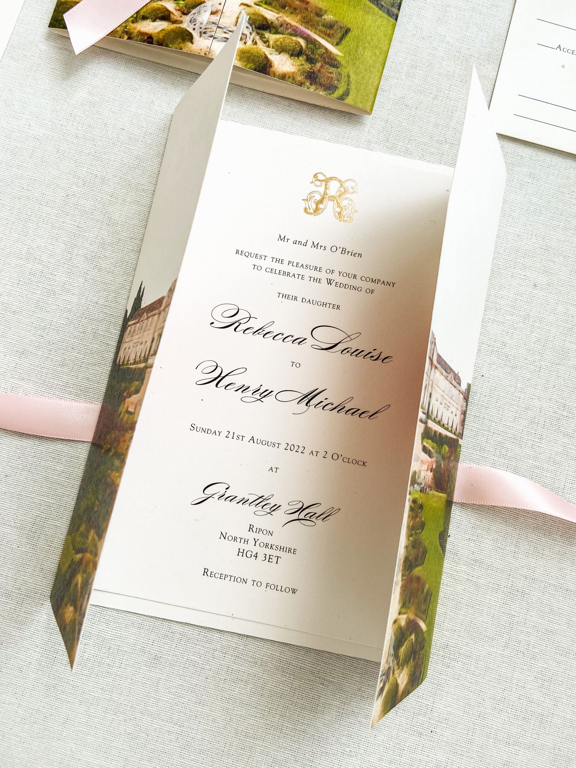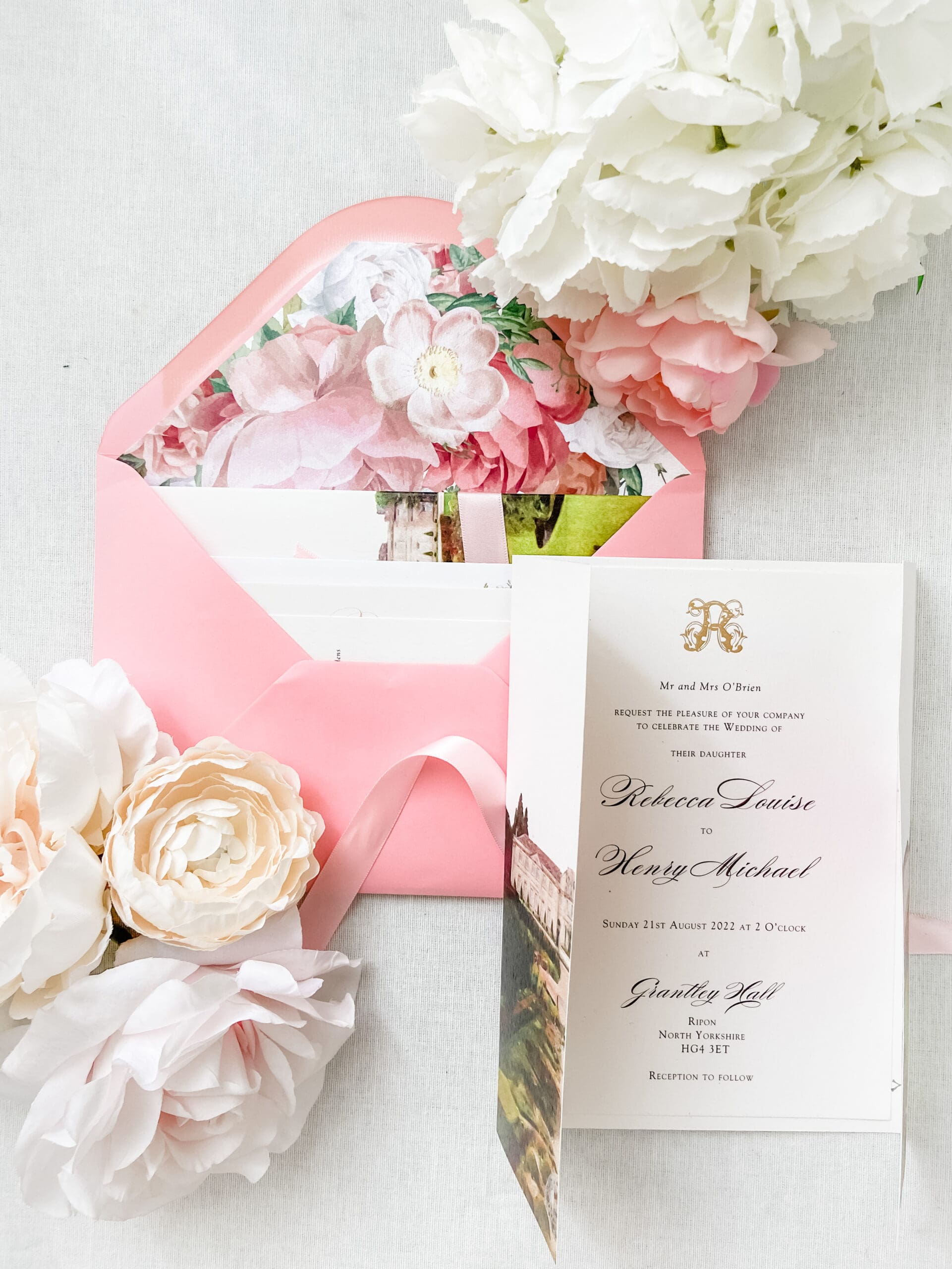 Introducing our exquisite gate-folded wedding invitation, inspired by the enchanting Grantley Hall, an awe-inspiring venue nestled in the heart of North Yorkshire. Designed specifically for the joyous union of Rebecca and Henry, this invitation captures their vision flawlessly: a painted venue, delicate hues of pink representing their chosen wedding colour, and the essence of their cherished wedding flowers. Behold the breathtaking result of their dreams brought to life. Prepare to be captivated by its sheer beauty and elegance.