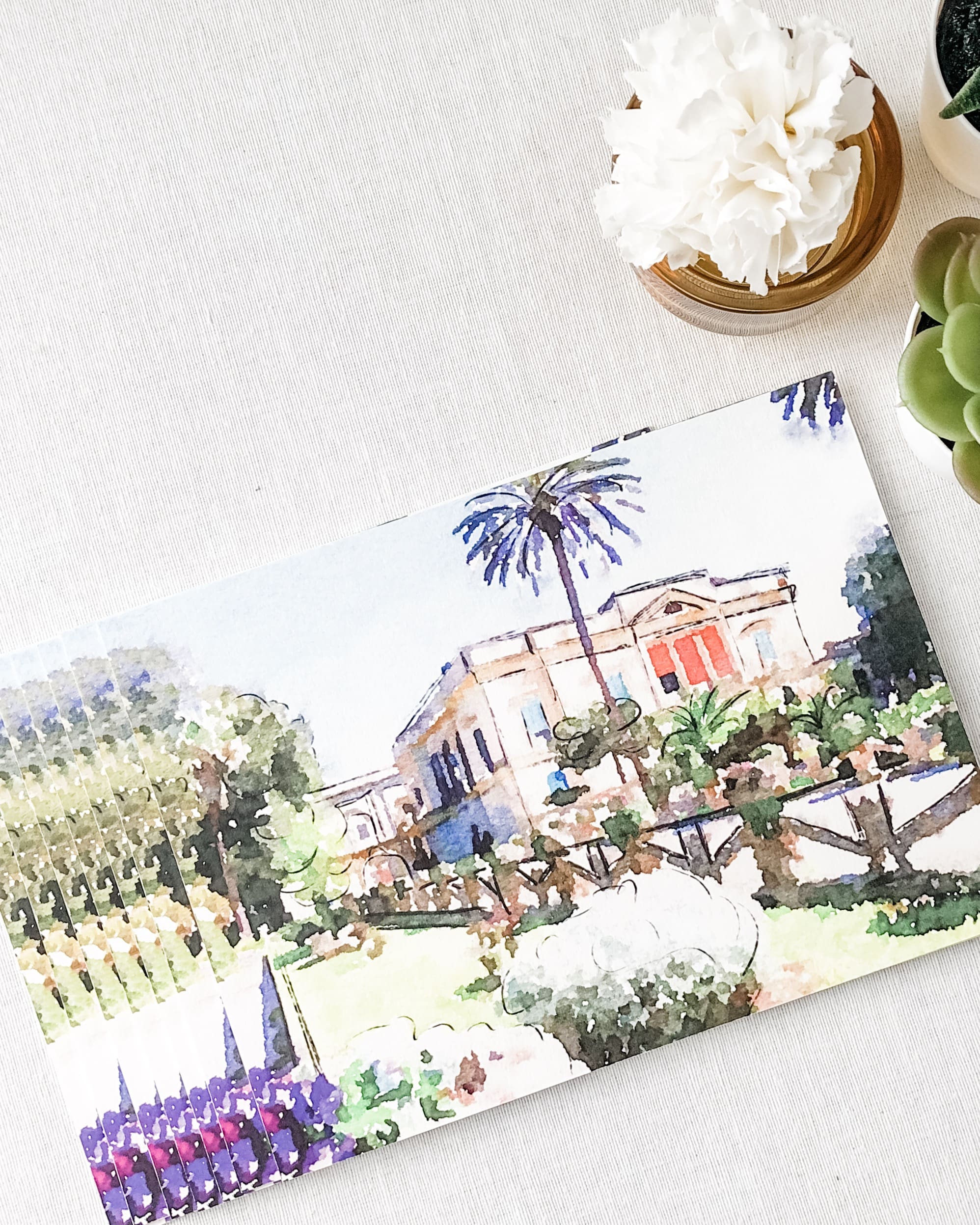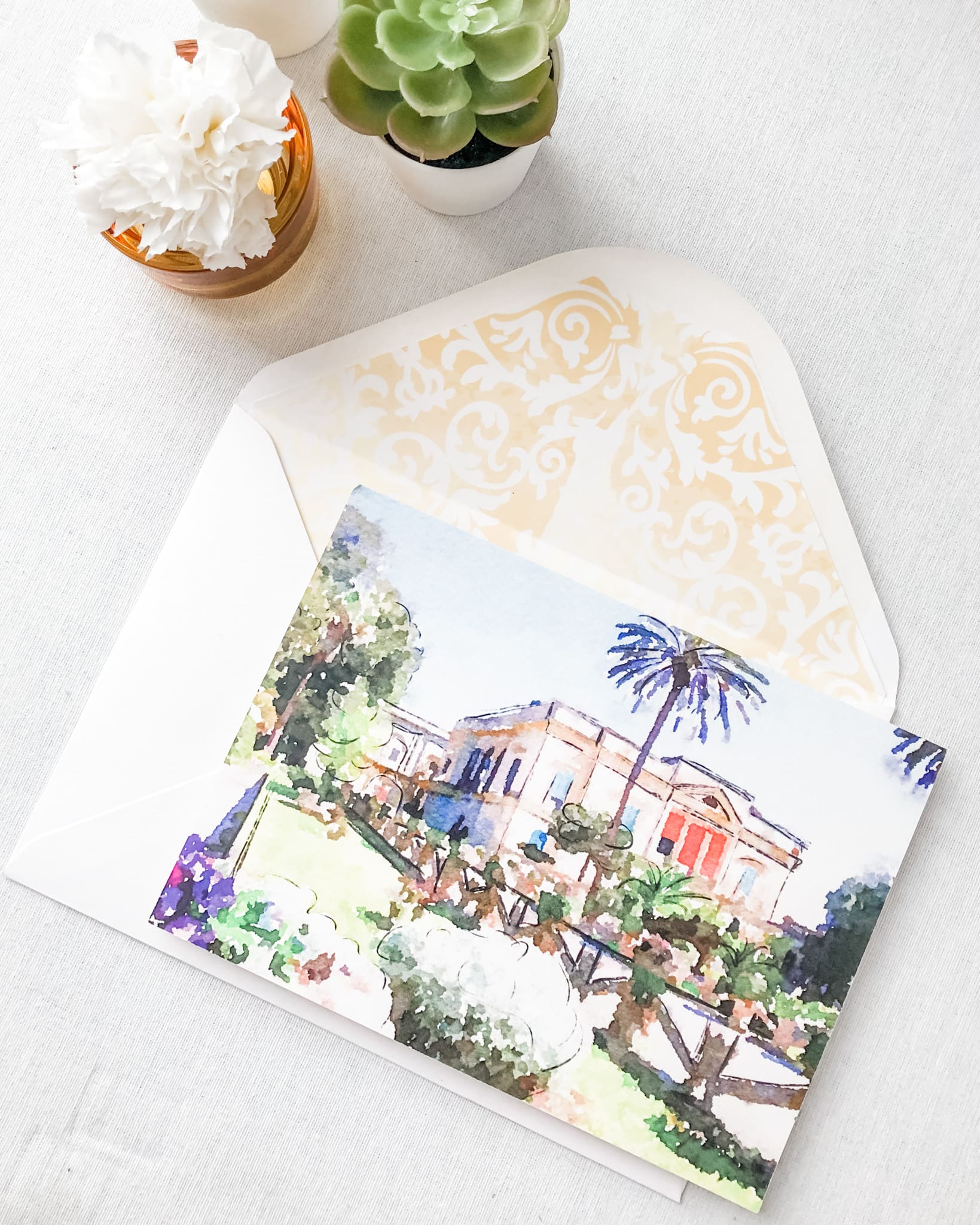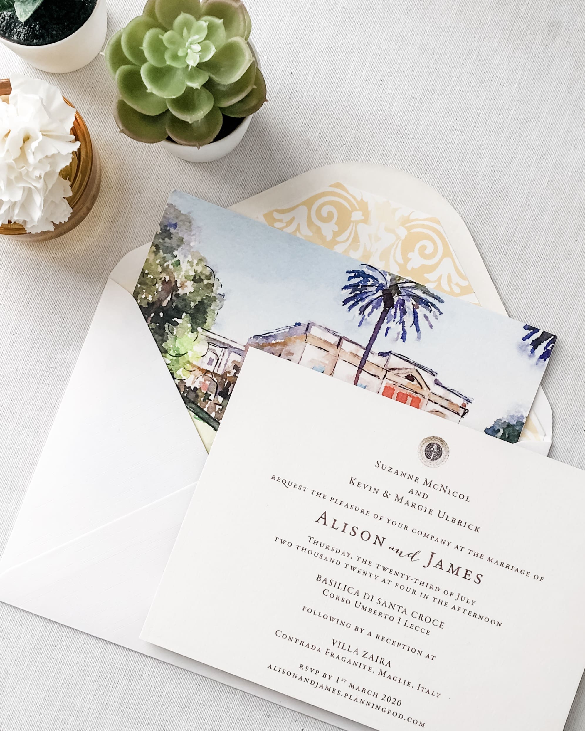 Alison and James are from Australia, and they planned a big Italian fat wedding in Puglia, exactly in Villa Zaira near Lecce. They wanted to give their guests a bit of the taste of what the wedding location will be. So we suggested illustrated wedding invitations. Having a custom venue wedding invitations is the best option for a destination wedding invitation.
