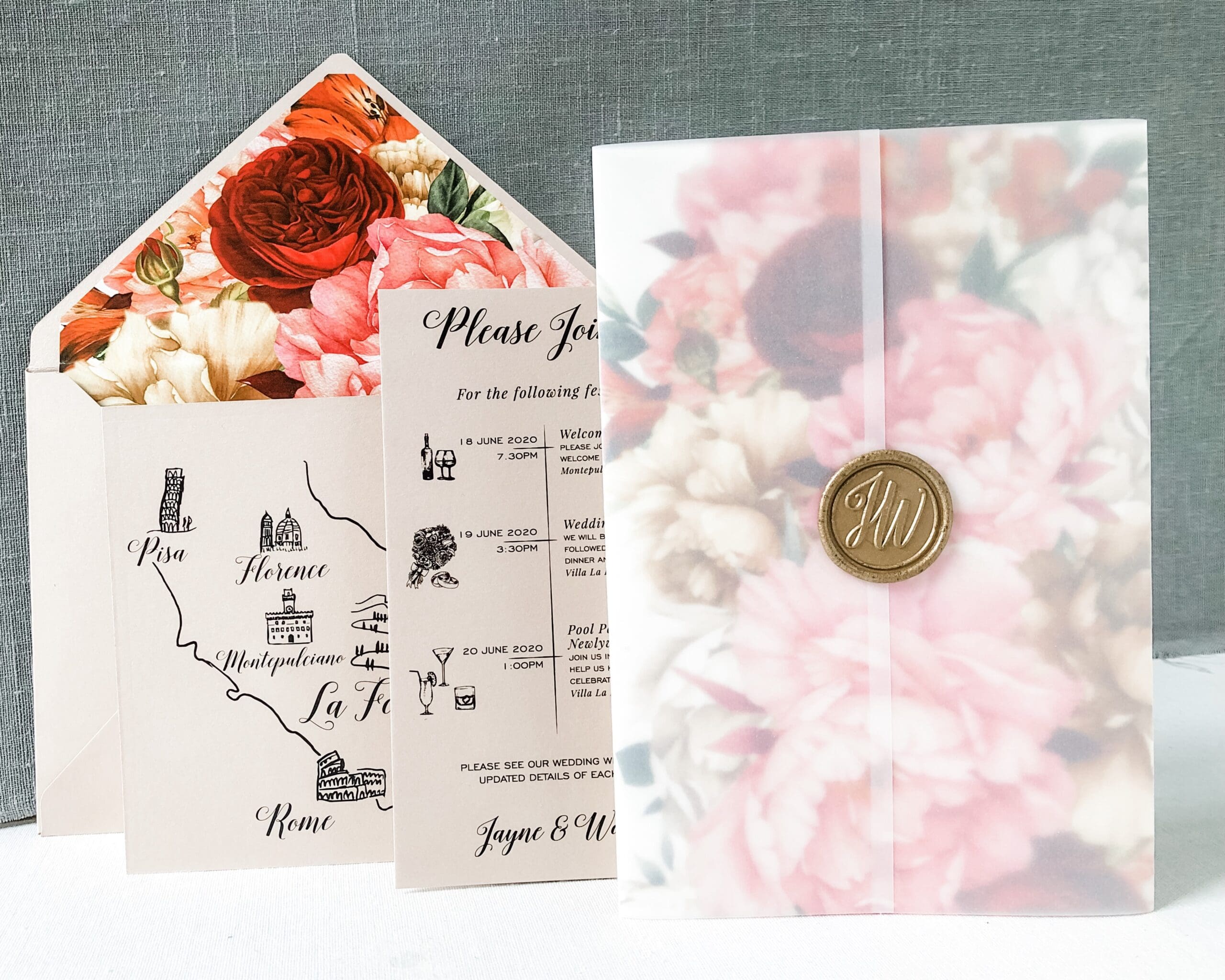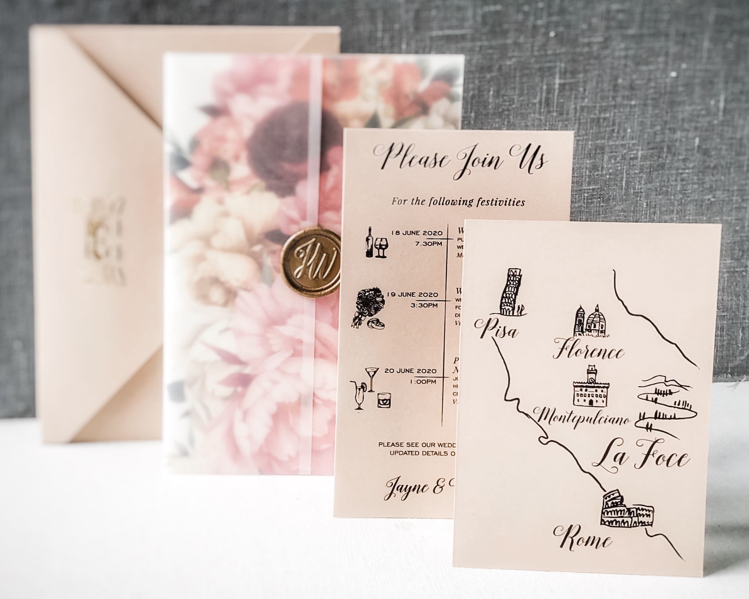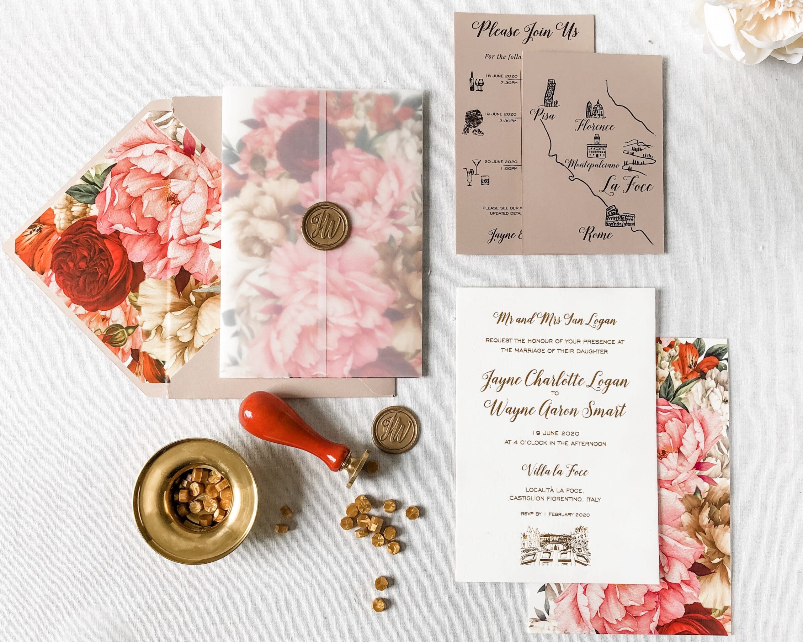 La Foce Wedding Invitation has been inspired by the Foce. An amazing villa in the Chiantishire in Italy. The property of La Foce lies on the hills overlooking the Val d’Orcia, a beautiful and miraculously intact valley in Southern Tuscany. Midway between Florence and Rome, it is also within easy reach of Siena, Arezzo, Perugia, Assisi, Orvieto. Renaissance and medieval gems such as Pienza, Montepulciano, Monticchiello and Montalcino are only a few miles away. The serpentine high tree is the symbol of this area. Our clients wanted also to incorporate their wedding flowers, and so we did.