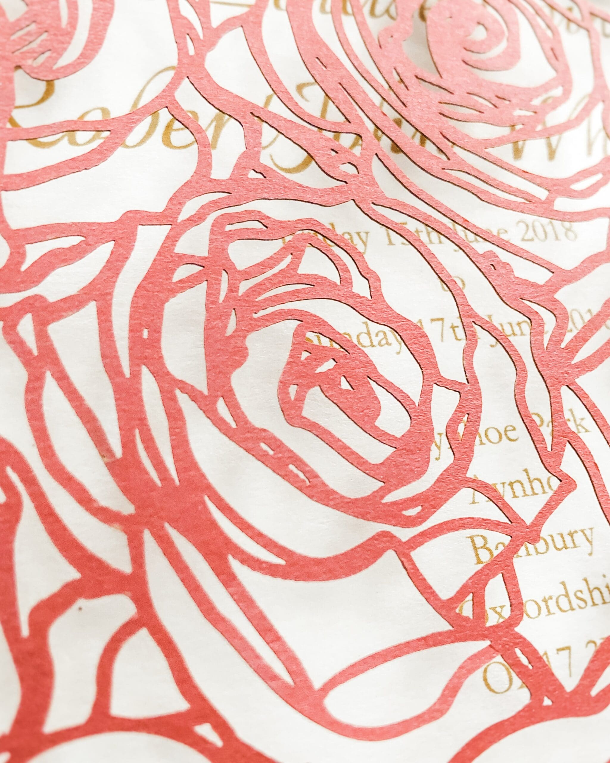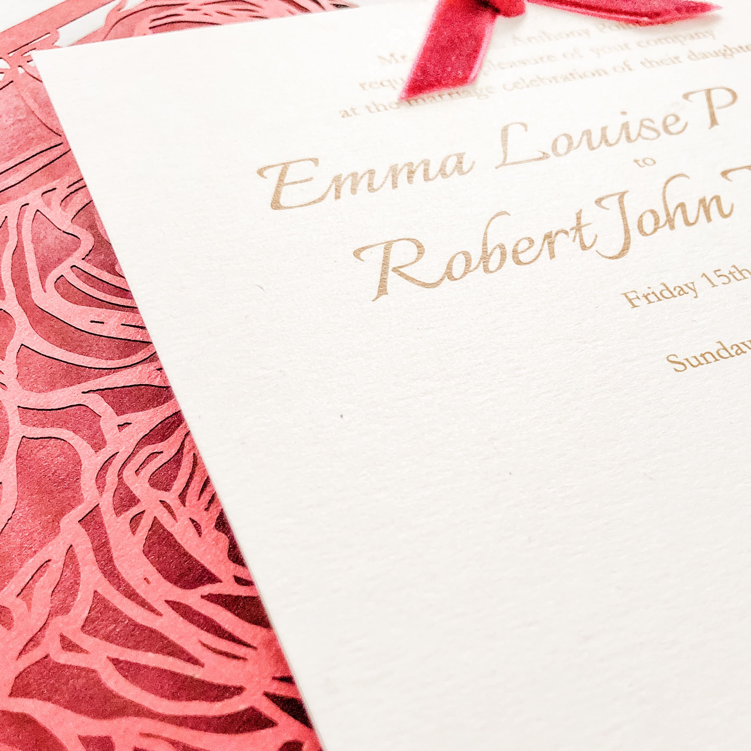 Here a laser-cut roses wedding invitations. One page invites printed on an ivory cotton card with a small red velvet ribbon, presented in a laser-cut red roses pocket. An elegant wedding invitation for your wedding.
