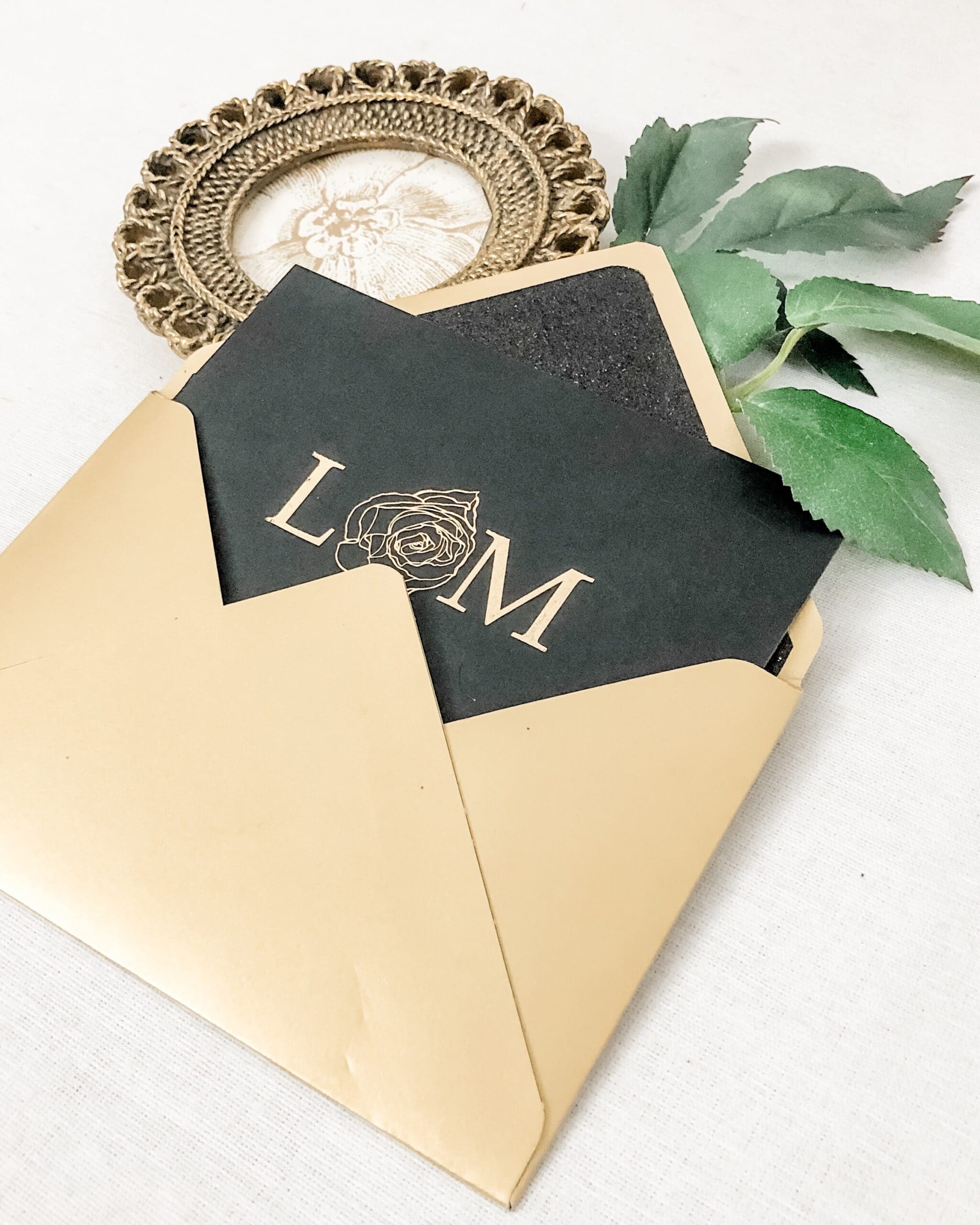A Modern Black and Gold Wedding Invitation is timeless! We created for this client, a beautiful monogram that integrated a rose outline.