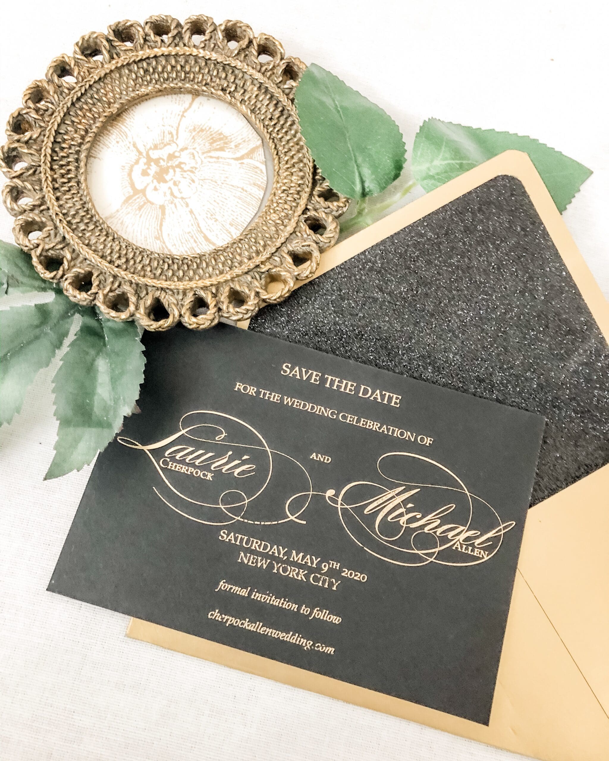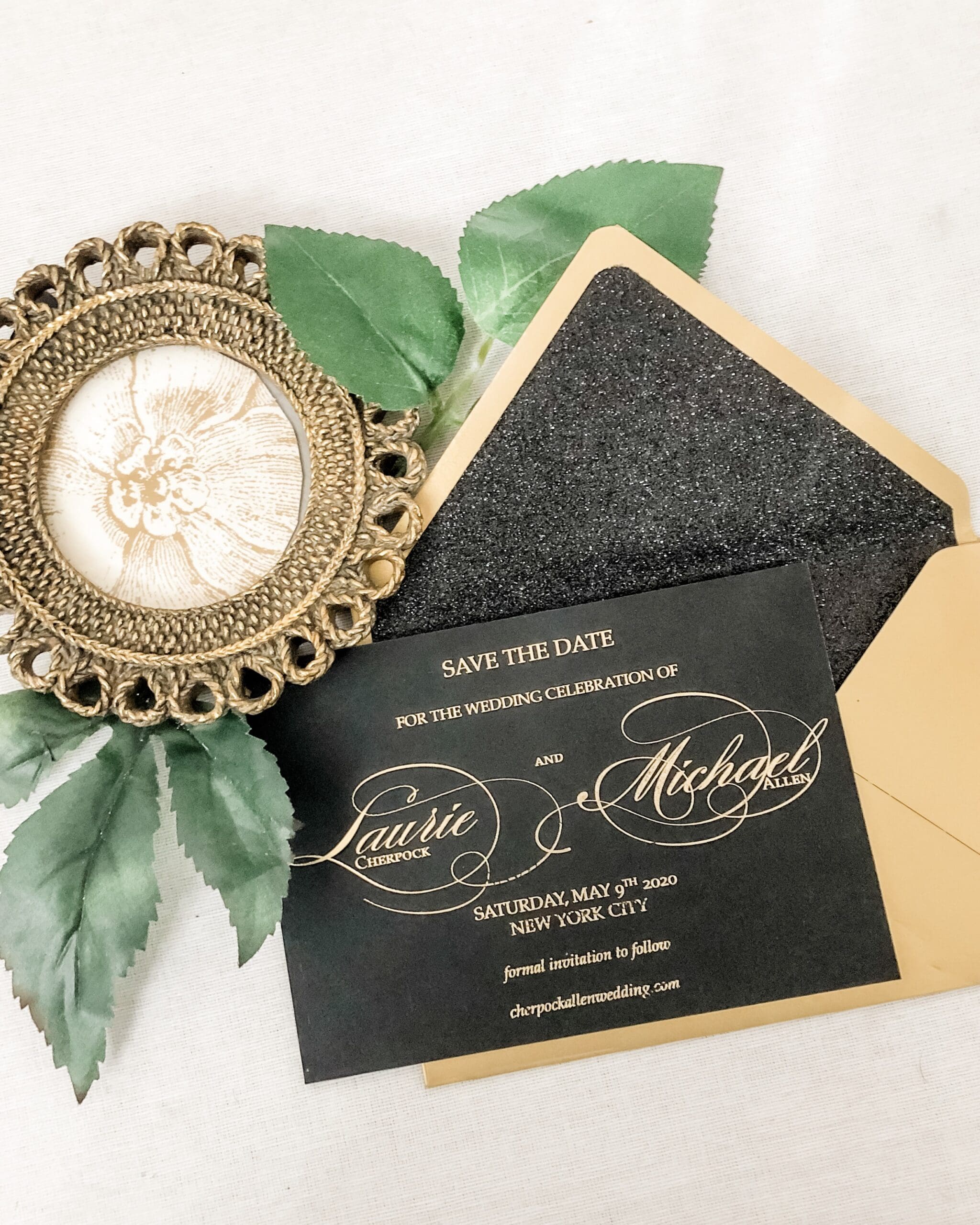 We used a black cotton 700gsm card stock and embossed it with gold foil. The envelope was custom made with 300gsm gold card and lined black glitter paper.
