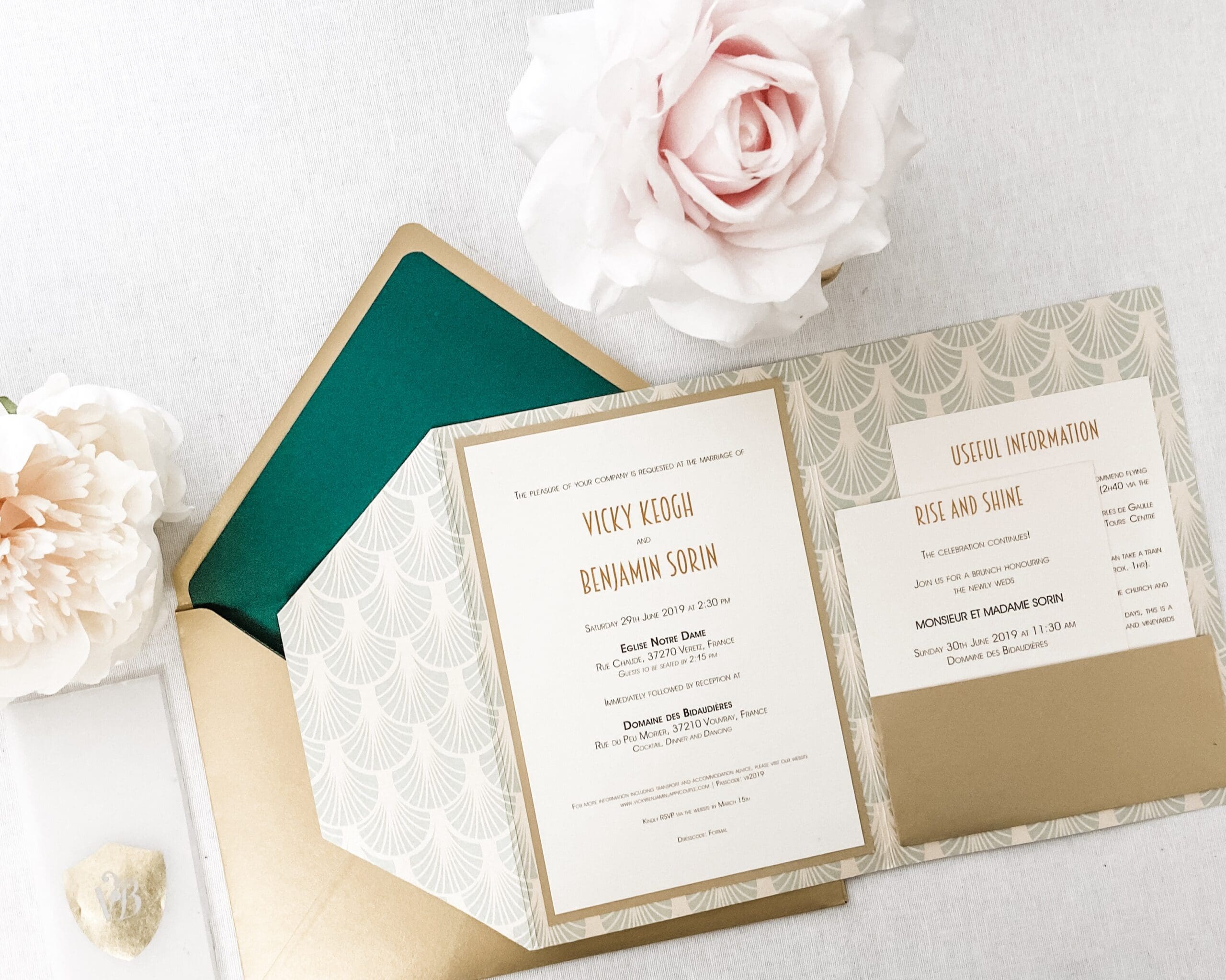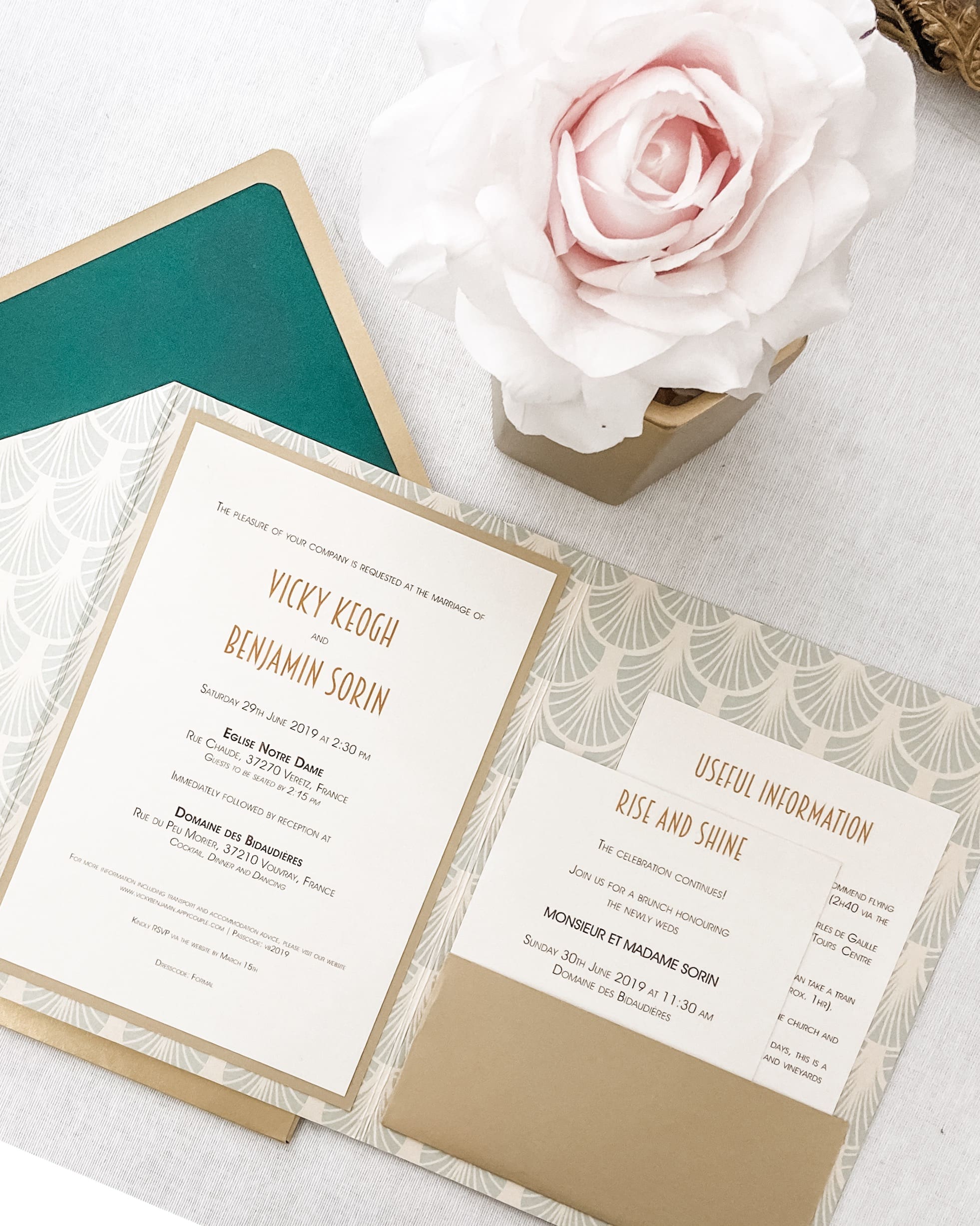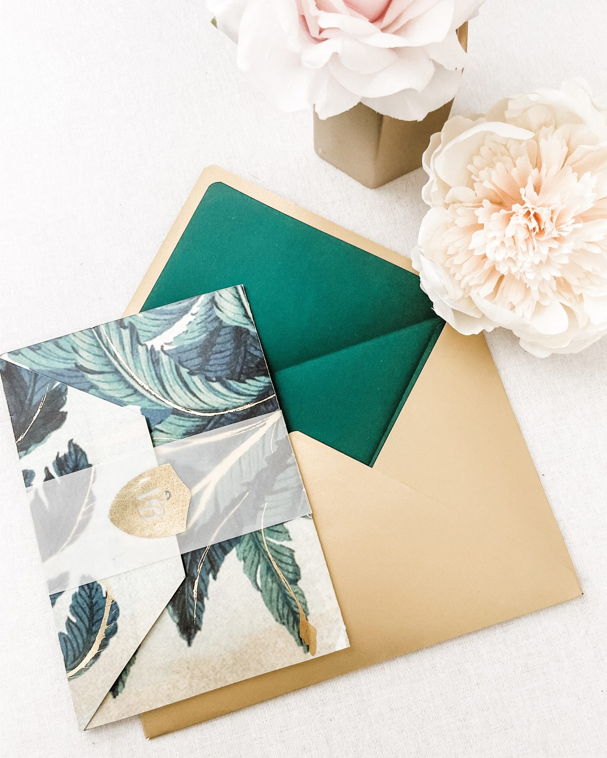Palm Leaf Wedding Invitations is a modern yet classic invite that will make your wedding truly special. Inside we chose an art deco pattern to give a roaring 20s feeling. To close the pocket, we used semi-transparent paper printed in gold foil, a truly unique presentation of your wedding.