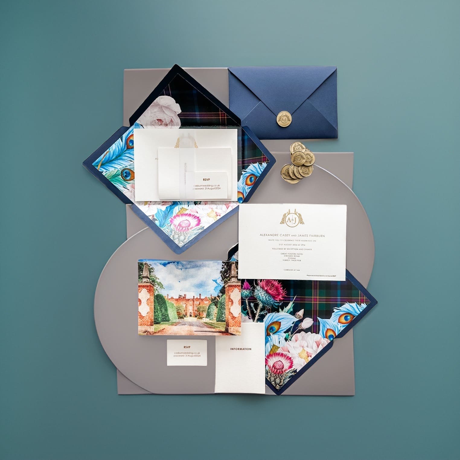 Embrace the enchantment of Scotland with this tailor-made wedding invitation suite, thoughtfully designed for a same-sex couple celebrating their love amidst the majestic beauty of Scottish landscapes. This bespoke creation is a heartfelt nod to their shared heritage and a tribute to their adoration of peacocks, symbolising the vibrancy and uniqueness of their union. The invitation features intricate tartan accents, a testament to the couple’s roots, and exuberant peacock feather designs, reflecting their profound connection to these regal birds. Presented in a stately navy blue envelope and sealed with a traditional wax stamp, this suite sets the stage for a wedding steeped in personal significance and Scottish pride. It is a beautifully crafted herald of their upcoming nuptials, inviting guests to partake in a ceremony that celebrates love in its most authentic and splendid form.