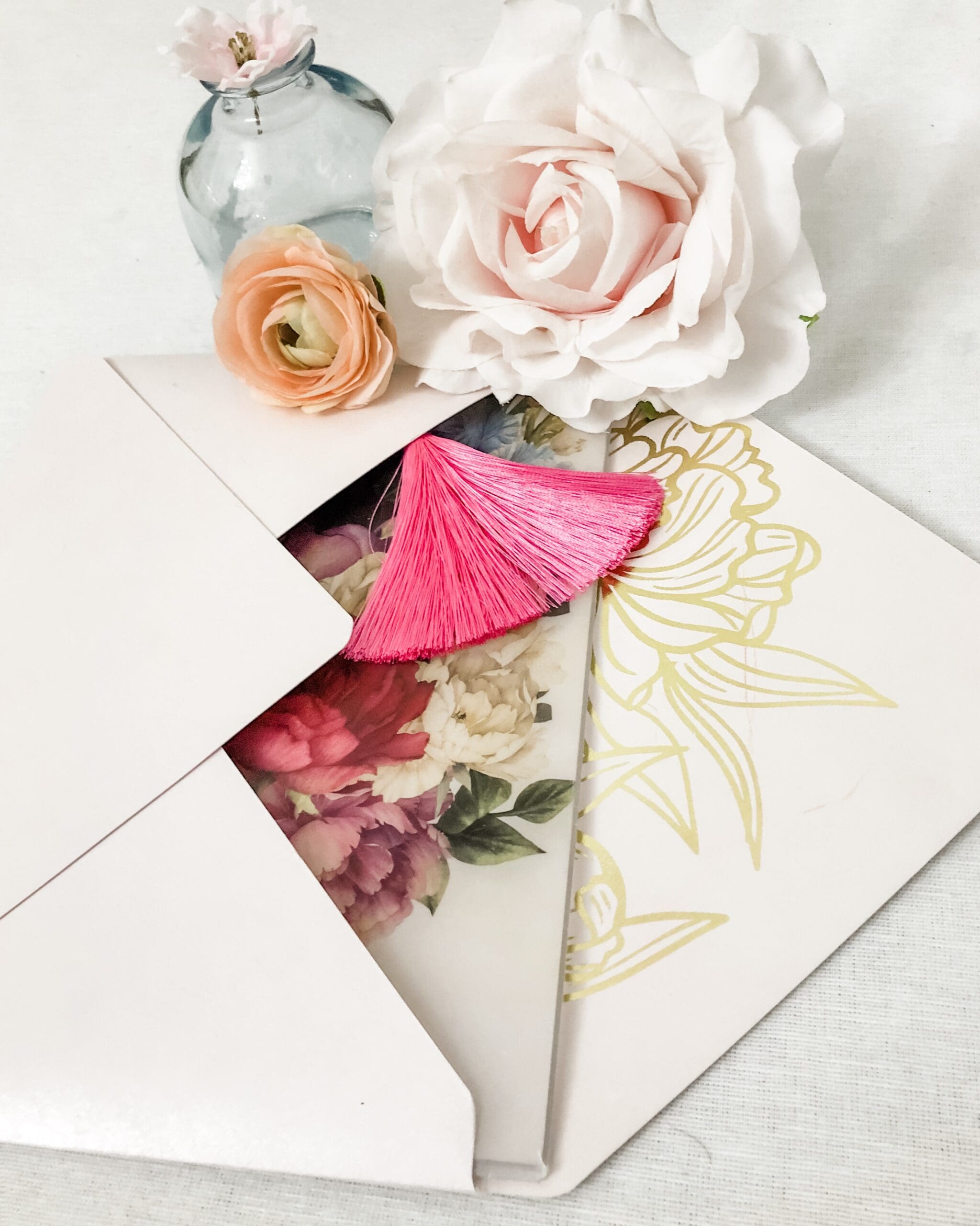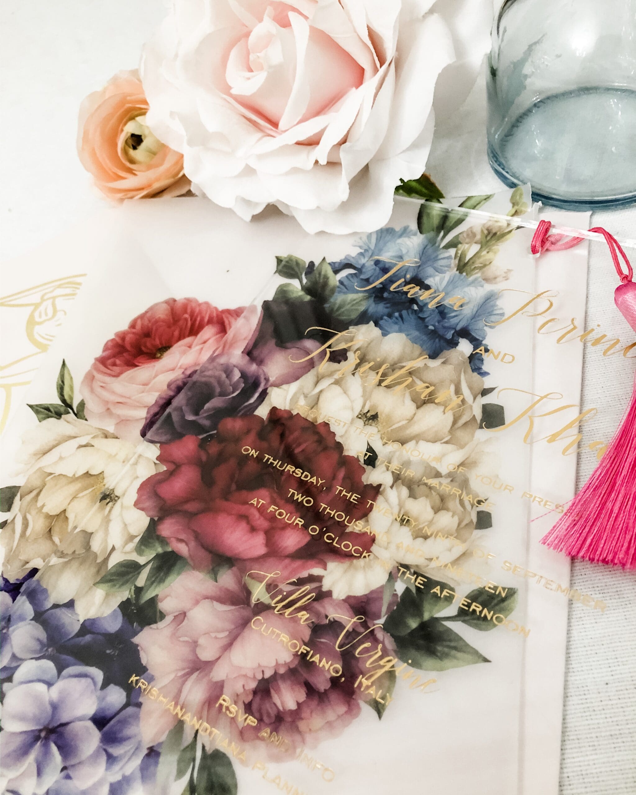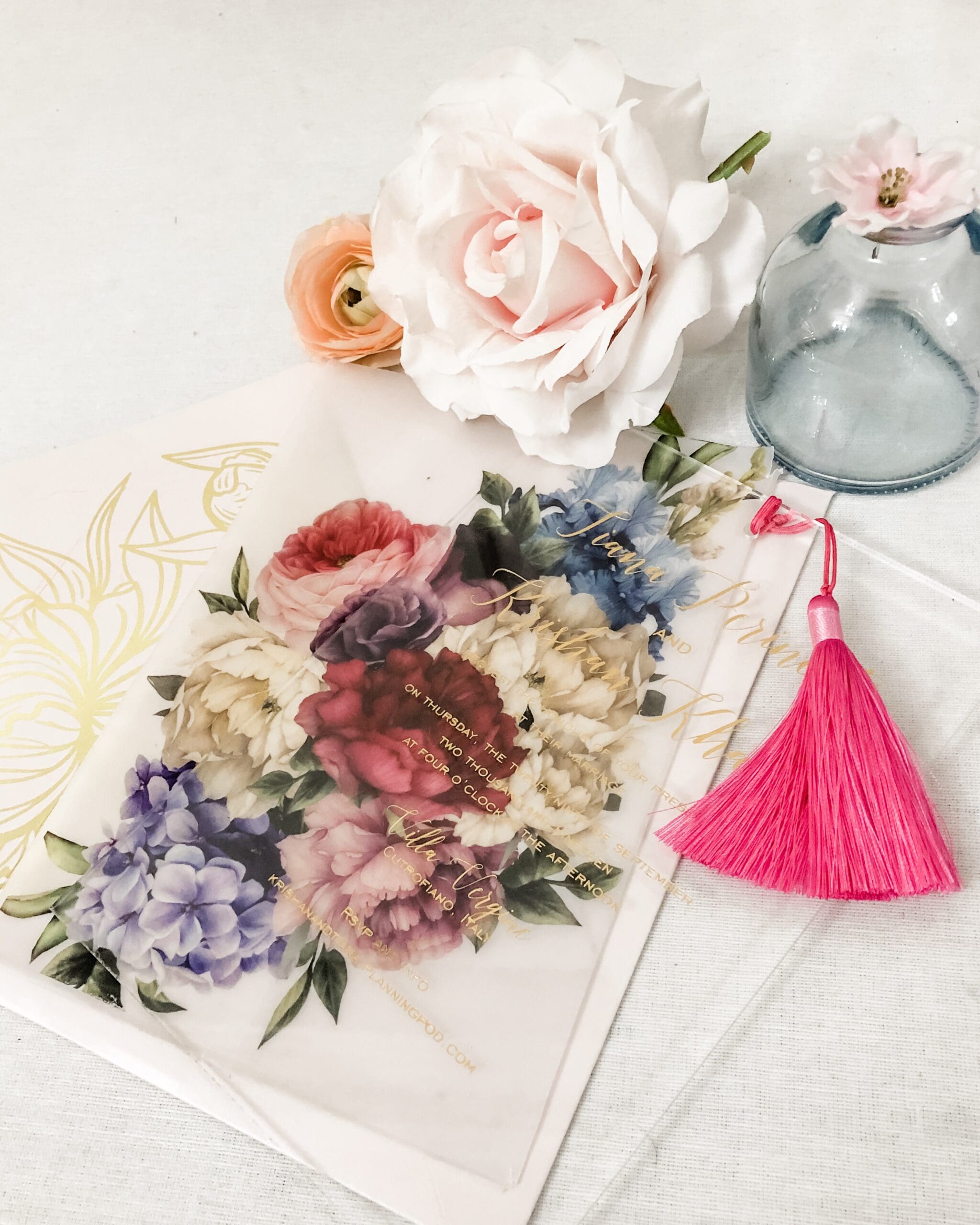 The invitation was printed in gold on perspex material and adorned with a silk tassel.