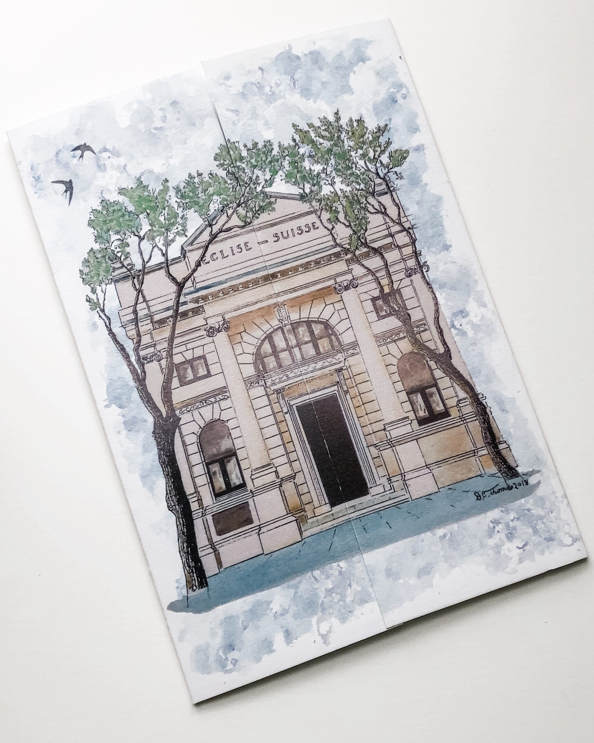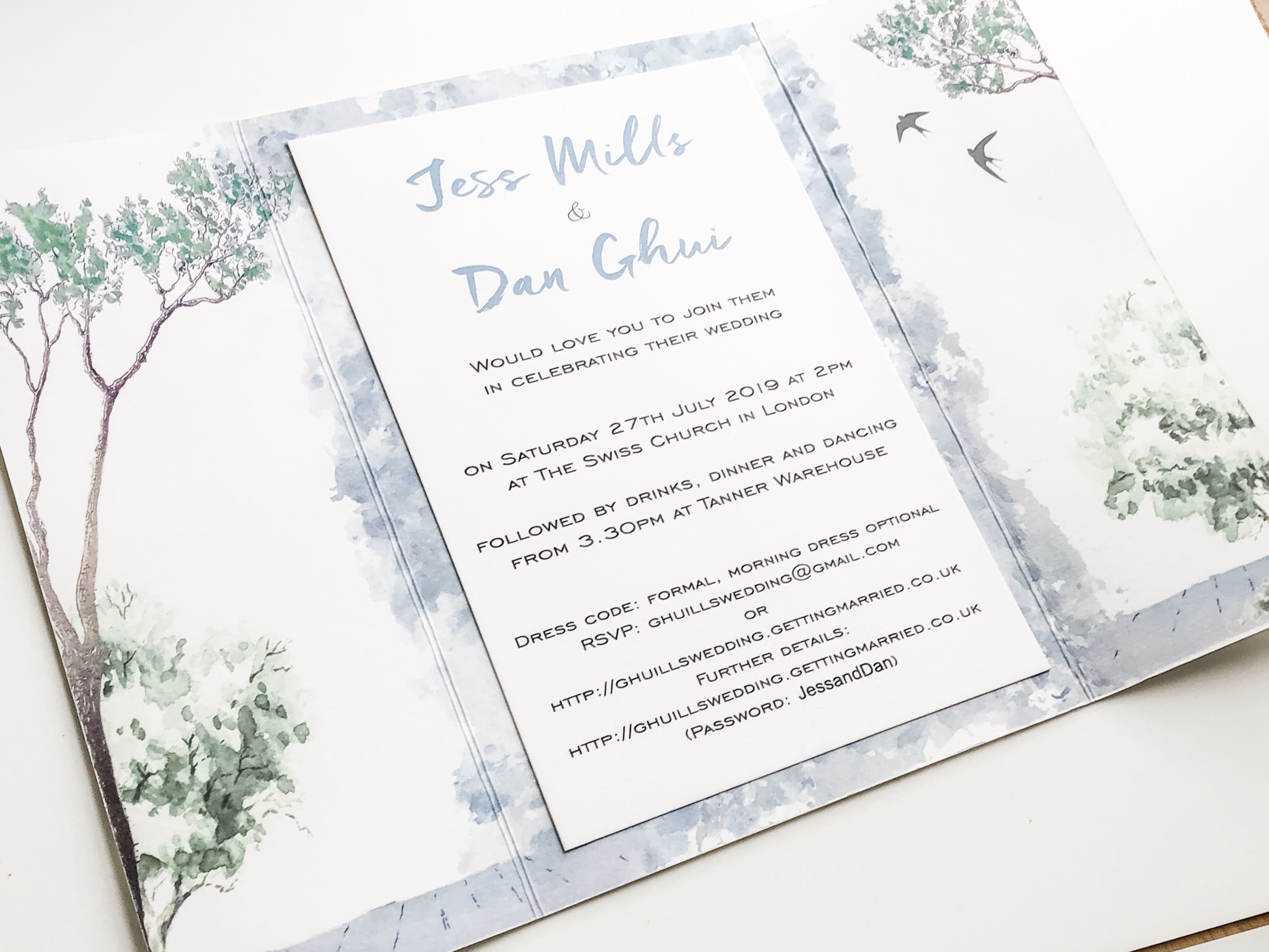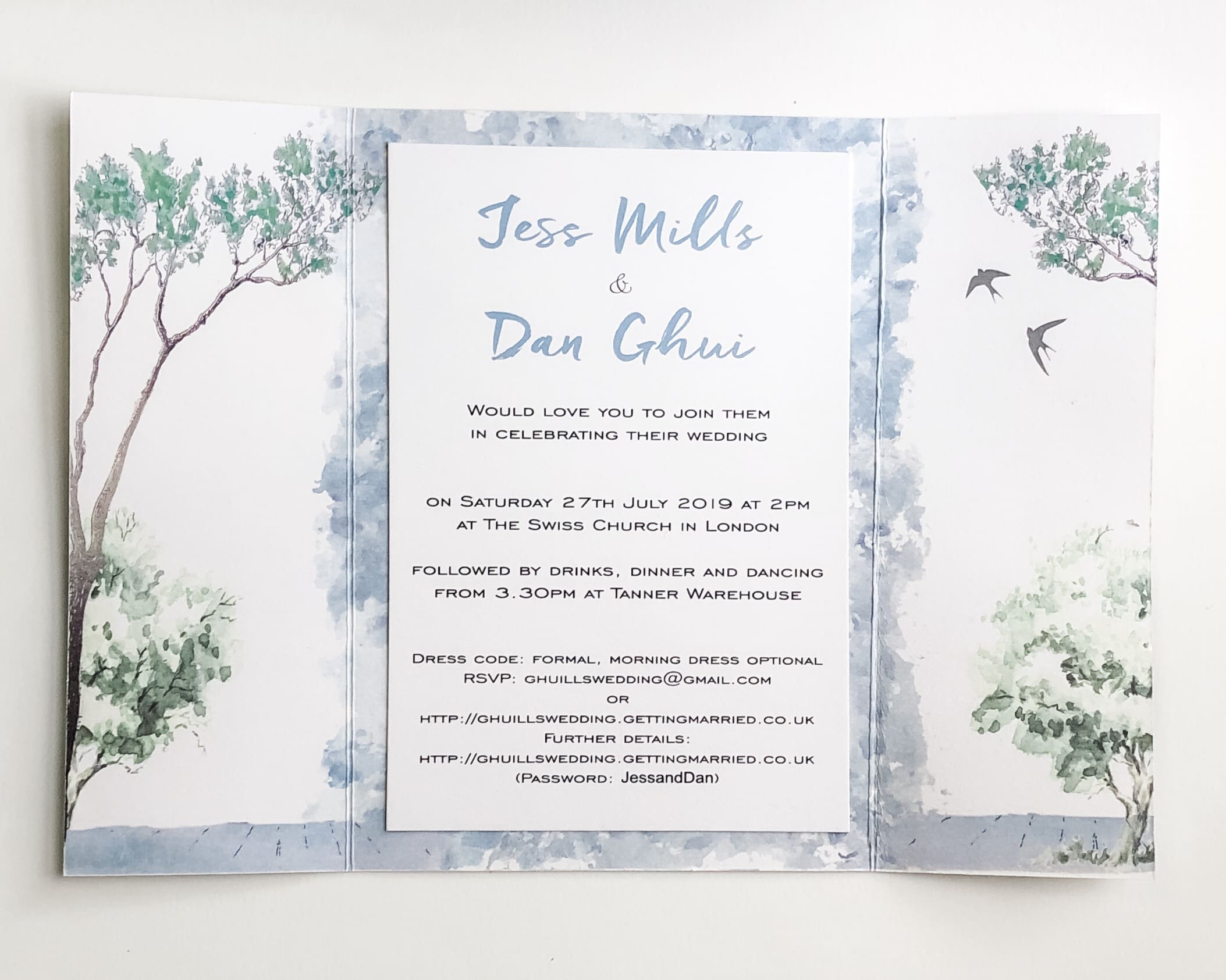 This artistic Watercolour Gatefold Wedding invitation was painted by Jess grandfather as his wedding presents to the new bride and groom. We scanned the paint and created the gatefold inside decor and paint. The printing was done on fine art paper.