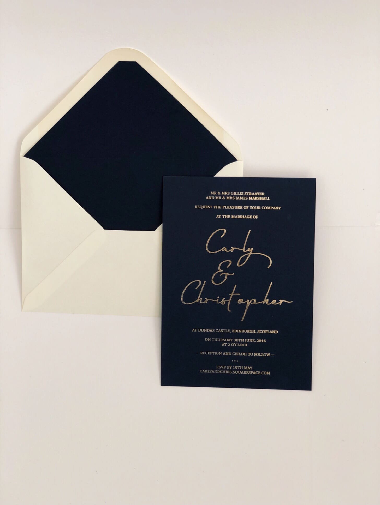 Gold and Blue Elegance Wedding Invitation it’s a modern, yet classic embossed invite which will make your wedding truly unique. to make this invite we used a very thick and exclusive card, it’s a truly unique presentation of your wedding. The invite has been hand pressed with a gold foil stamp.