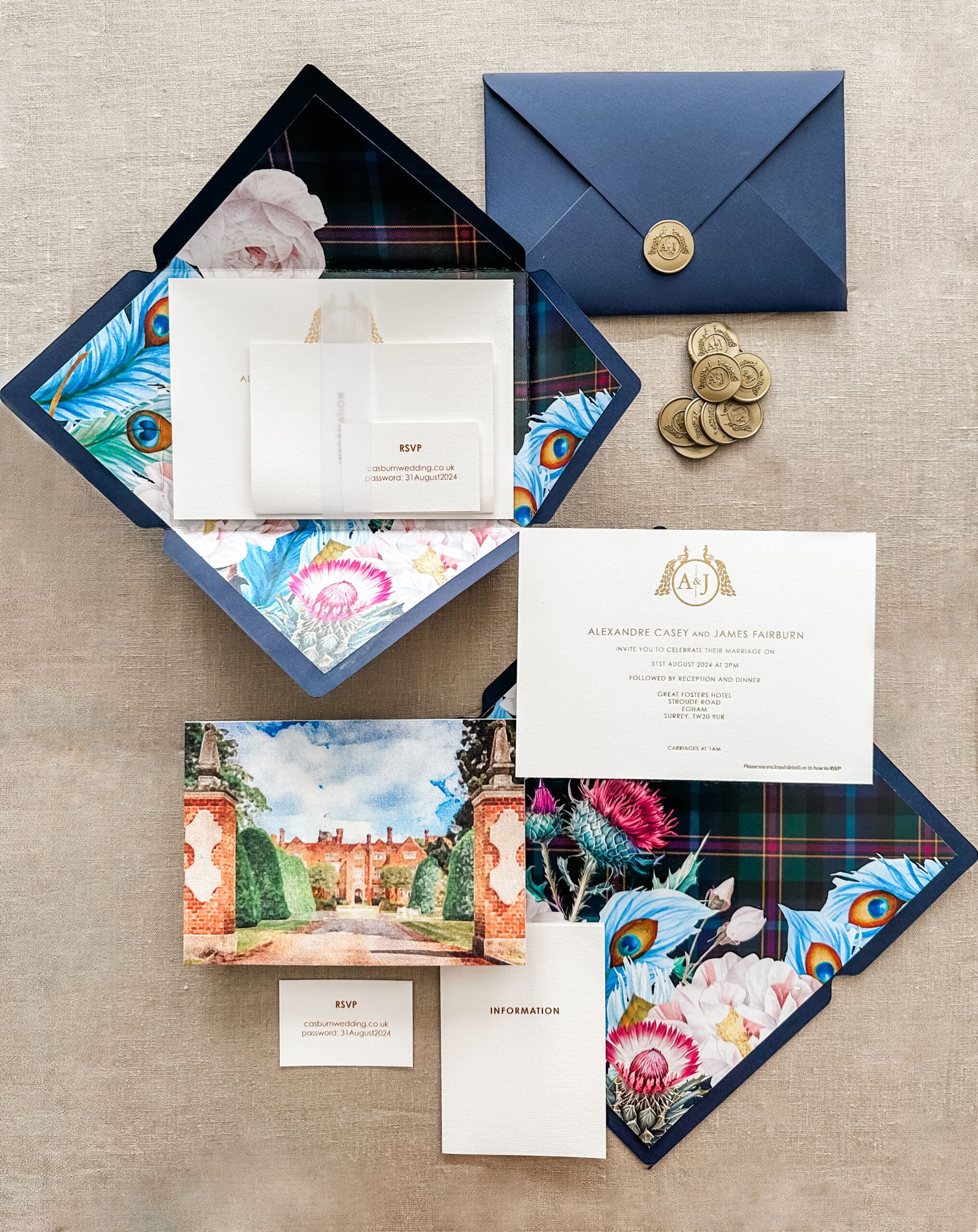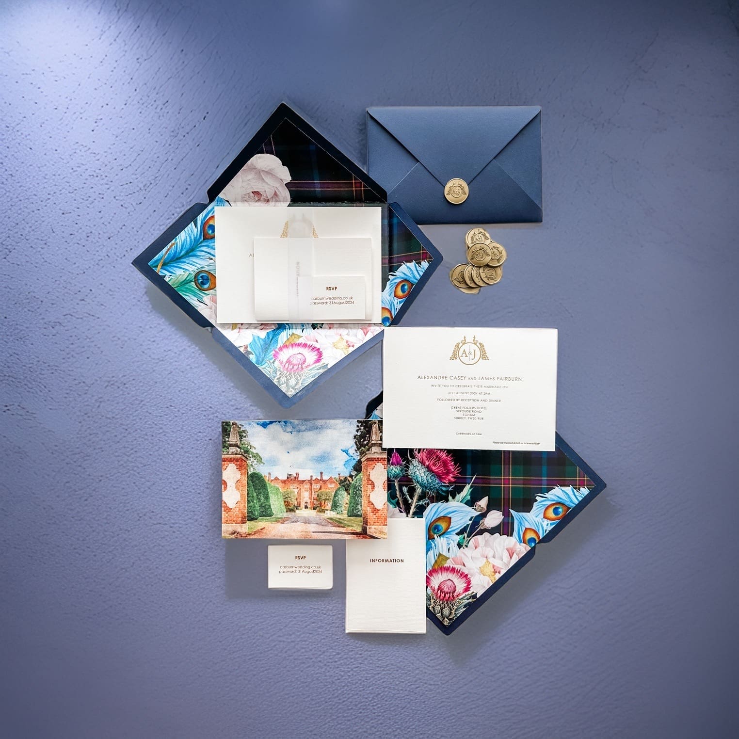 Craft a quintessential Scottish wedding invitation ensemble that effortlessly marries tradition with modern elegance. This bespoke invitation suite captures the romantic essence of Scotland with its sophisticated tartan detailing nestled inside the envelope, paying homage to the timeless Scottish heritage. The vibrant peacock feather accents and lush floral motifs imbue a sense of noble grandeur, perfect for a wedding set against the backdrop of Scotland’s majestic landscapes. The use of a deep navy blue envelope, sealed with a classic wax stamp, adds an air of aristocratic charm, beckoning guests to a celebration steeped in the rich tapestry of Scottish culture. Complete with an RSVP card and additional information elegantly presented on crisp, high-quality paper, this invitation is a prelude to the enchantment and splendour of a Scottish wedding. Perfect for couples looking to infuse their special day with the spirit of Scotland, these invitations promise to set the tone for an unforgettable union.