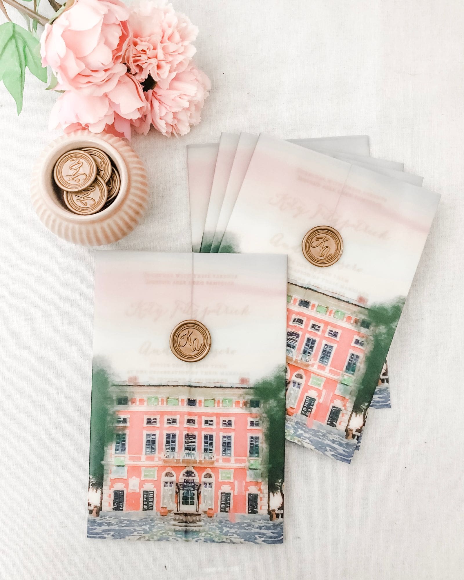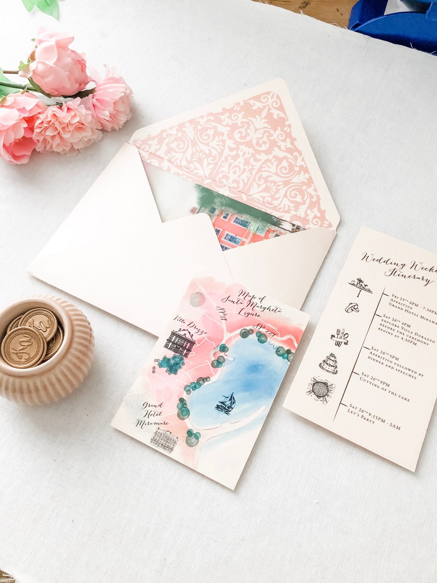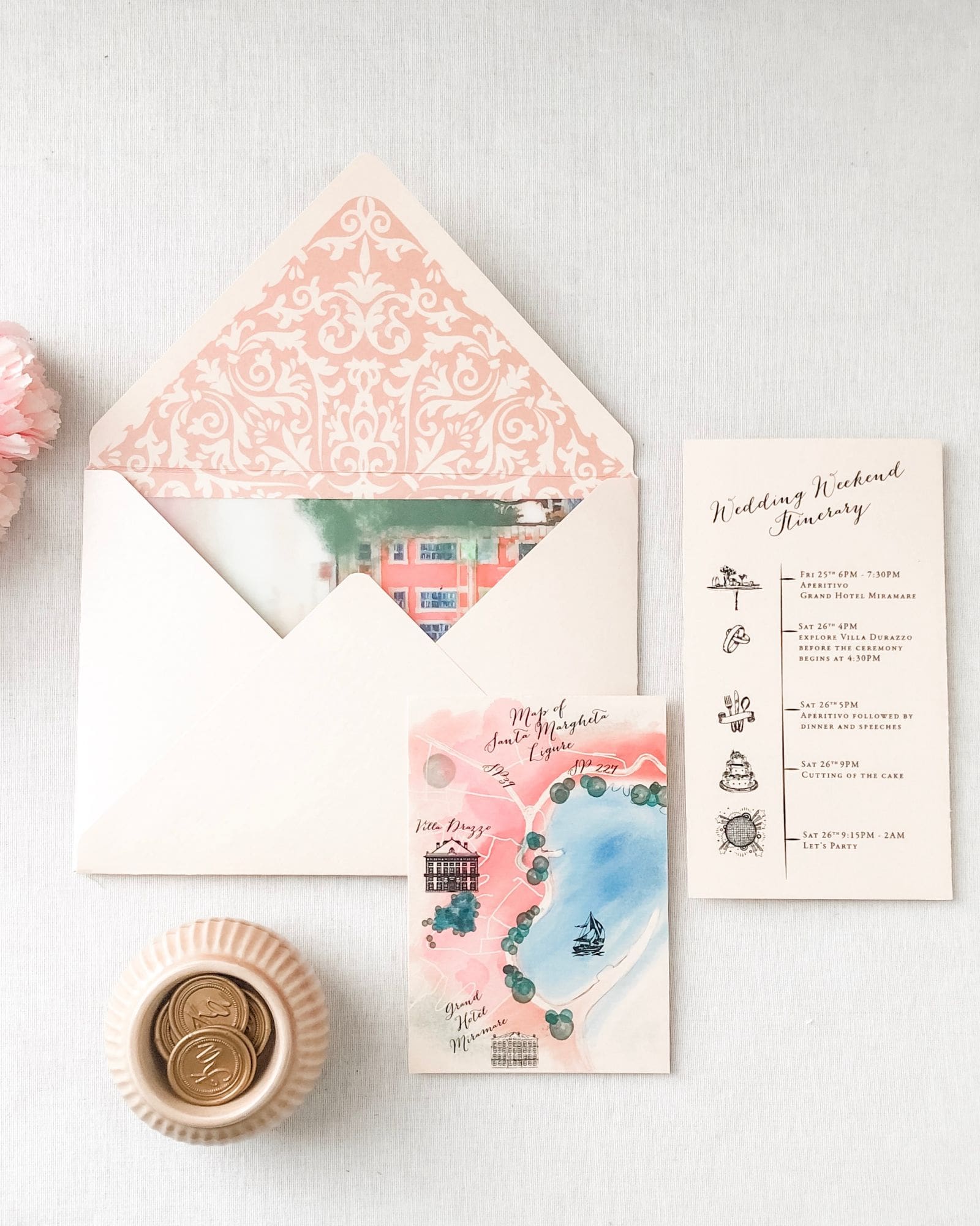 Villa Durazzo wedding invite has been created to get the guests excited to the beautiful Cinque Terre coastline. Villa Durazzo is a really well-known place to get married in Italy. The villa inspired our couple for their wedding invites design. We repainted the villa in soft watercolours and included a map inside the invitation to show the beautiful place where is set the wedding.